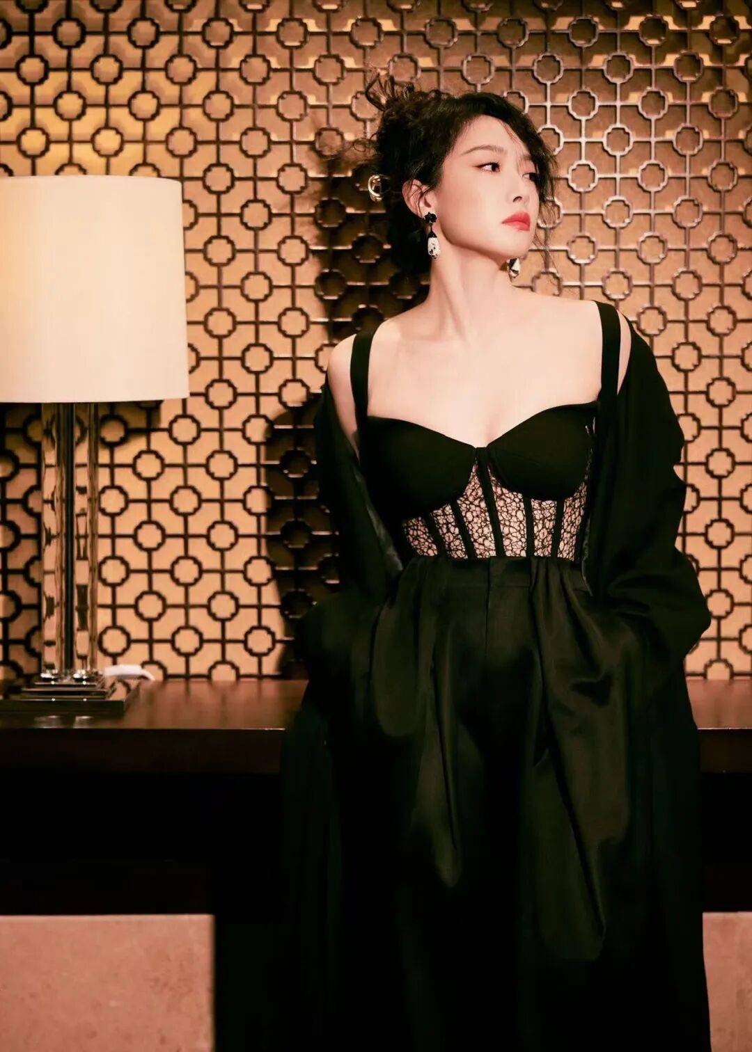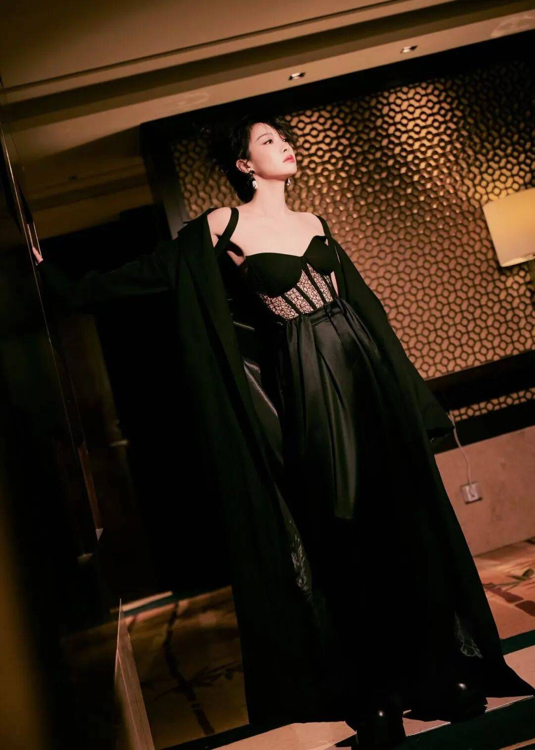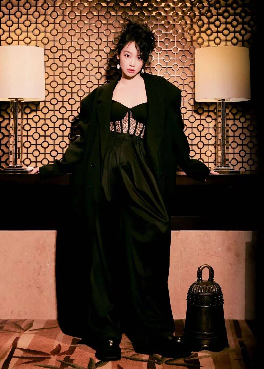 陈乔恩身穿蕾丝胸衣外搭黑色大衣,一身All Black穿搭又美又飒,绝对性感撩人!