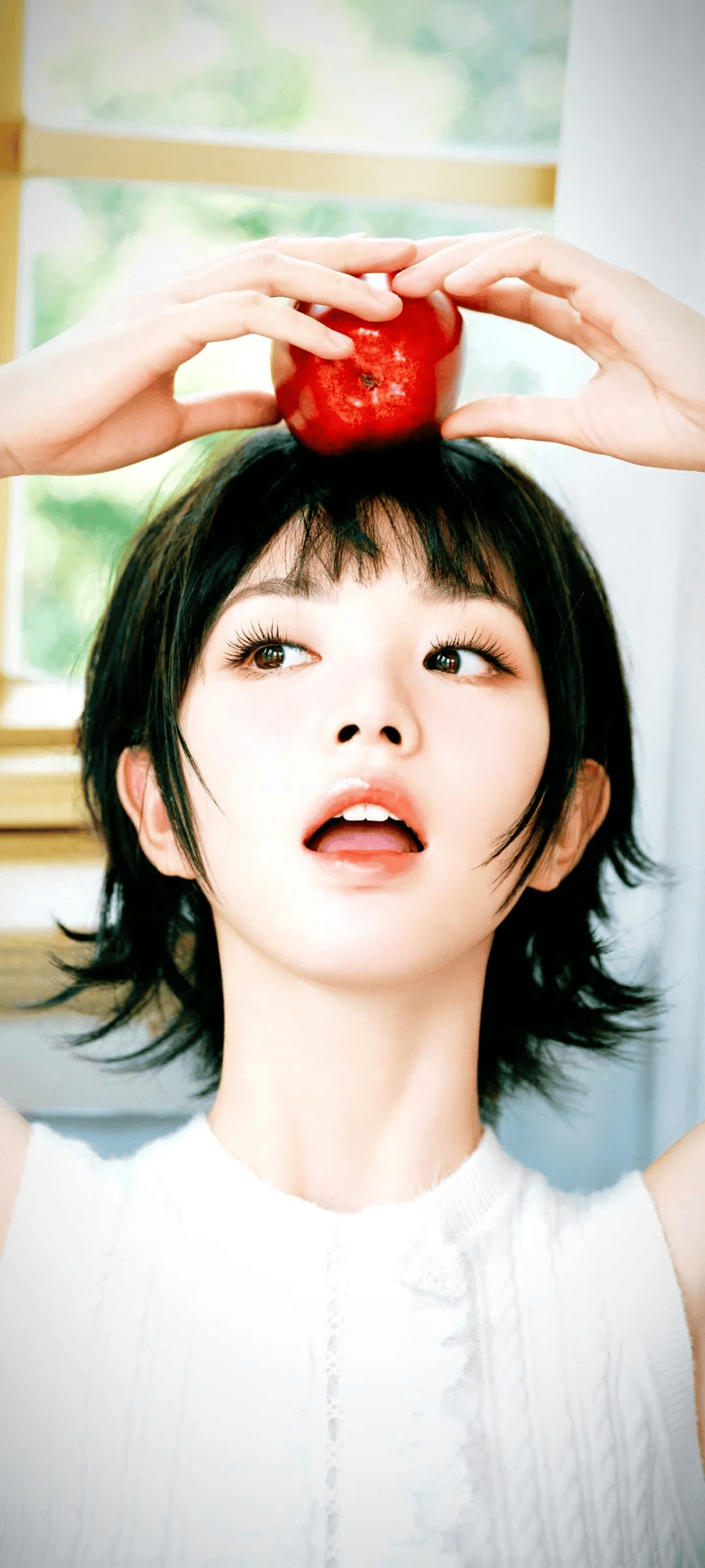 陈乔恩一出现,就像春日里吹来的一阵甜风,妥妥的“清纯甜妹天花板”——圆溜溜的大眼睛像两颗黑葡萄,笑起来时弯成月牙,卧蚕里仿佛藏着星星;脸颊上的小梨涡随着笑容若隐若现,让人忍不住想戳一戳;蓬松的短发扎成半丸子头,发尾翘起的弧度都透着“可爱到犯规”的劲儿,连说话时尾音自带的软糯感,都像棉花糖一样让人心都化了。