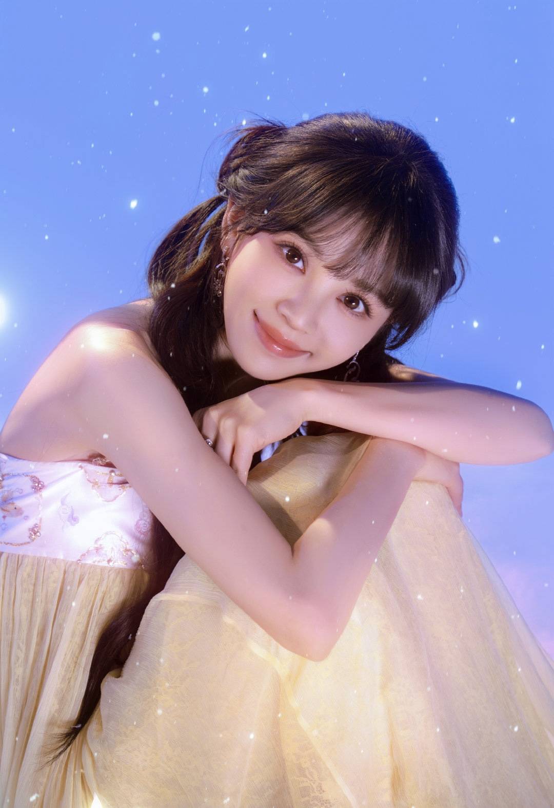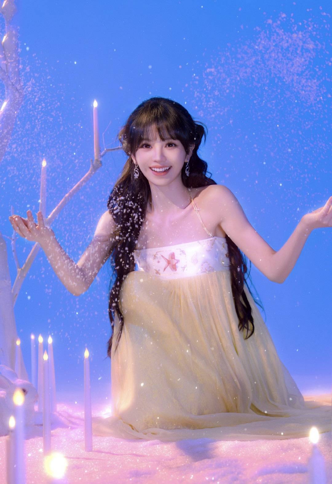 写真中,她头戴兔耳发簪与绒球挂饰,置身于桂树婆娑、明月高悬的梦幻布景中,背景光影流转,仿佛真的将神话中的月宫搬到了现实。她圆润的大眼闪烁着天真光芒,梨涡浅笑间甜度爆表,冷白肌肤在鹅黄色调的映衬下更显通透如瓷,被粉丝亲切称为“人间垂耳兔”。每一个镜头都精准捕捉到了她与玉兔形象的天然契合,既有古典仙气,又不失少女元气,令人移不开眼。