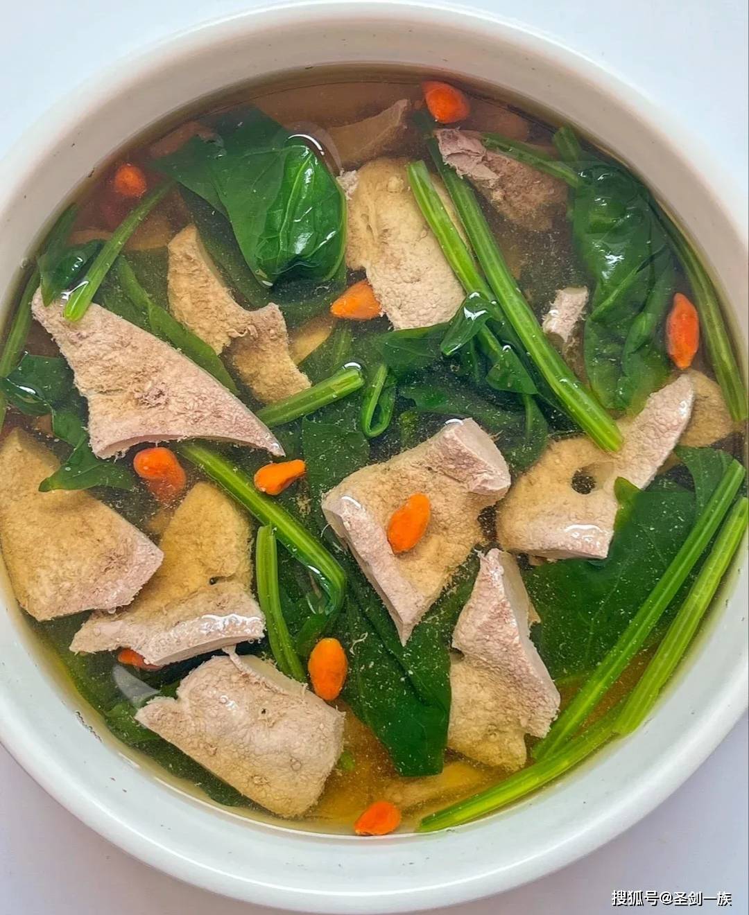 食材:猪肝、菠菜、姜丝、料酒、生抽、蚝油、盐、淀粉 做法: 1. 猪肝切薄片,洗净血水,加姜丝、料酒、生抽、蚝油、盐、淀粉抓匀,腌制 20 分钟。 2. 菠菜焯水 30 秒捞出;猪肝焯水至飘起捞出。 3. 热锅冷油炒香姜丝,加开水,放入菠菜和猪肝,加盐调味后盛出。 五、番茄西兰花炒蛋