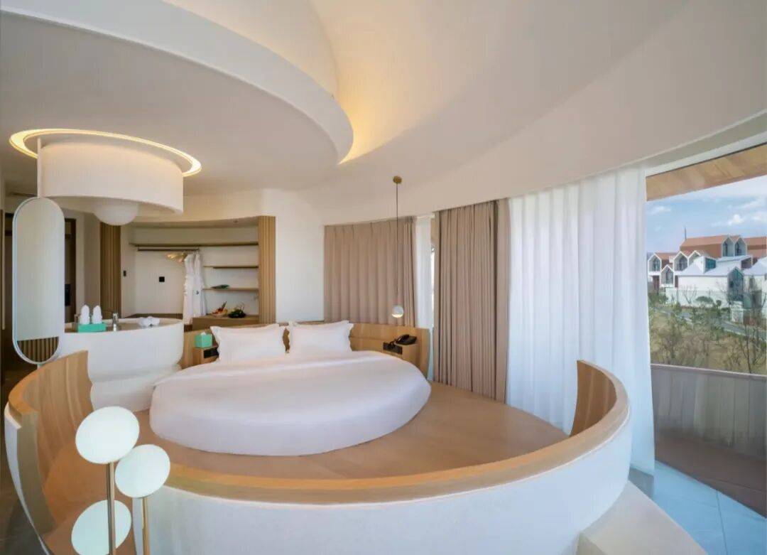 林间之巢效果 ©梁山 形态生成:非标准曲线的模块化实现。“林间之巢”的设计语言源于对自然形态的抽象转译。其屋体从鸟巢、蚕茧等生物构筑物中汲取灵感,形成了非标准化的、流动的有机曲线。这种流线型体量打破了传统建筑的几何刚性,使其以垂直群落的姿态,如同自然生长般融入林地与海岸环境,成为城市景观系统本身的一部分。 整体生成