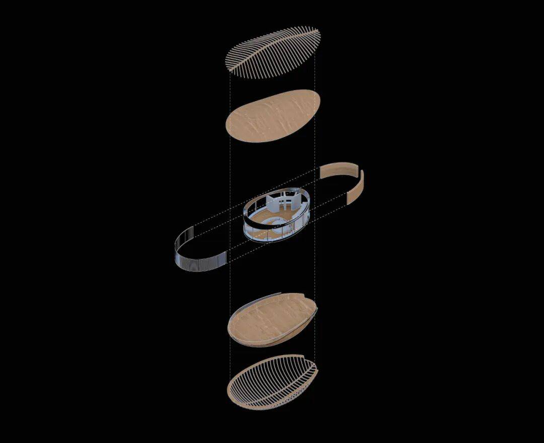 单体爆炸 空间策略:全景视野与微沉浸体验的整合。在空间体验的营造上,“林间之巢”强调“沉浸”与“远眺”的双重性,塑造在无边界视野高空中的巢居感。270度的全景落地窗作为建筑的主要界面,将无敌的林景、海岸与阳光最大限度地引入室内,模糊了内部舒适空间与外部自然景致之间的物理边界。所有核心功能管线被巧妙地隐藏于结构体之中,确保了外观造型的纯粹与完整性。空间内部,智能系统与无缝网络协同工作,在野趣盎然的自然环境中,构建出一个高度便捷、舒适与安全的现代化微沉浸栖居单元。