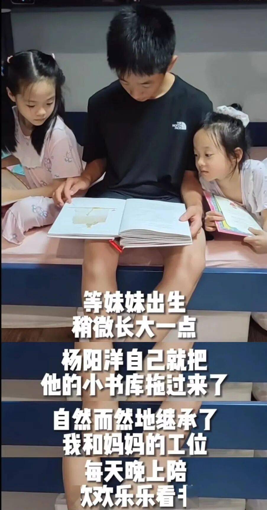 不仅对妈妈贴心,也很会照顾妹妹。 小时候睡觉前父母陪他看书,现在妹妹长大了,杨阳洋每天晚上自然而然地陪妹妹们看书👇