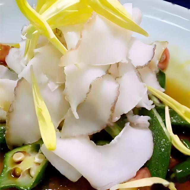 花胶,即各种大型鱼的鱼鳔干制品,因其富含胶质而得名,古时便是"参翅八珍"之一。白切花胶最大限度地保留了花胶的原汁原味,口感软糯滑嫩,胶质丰富。