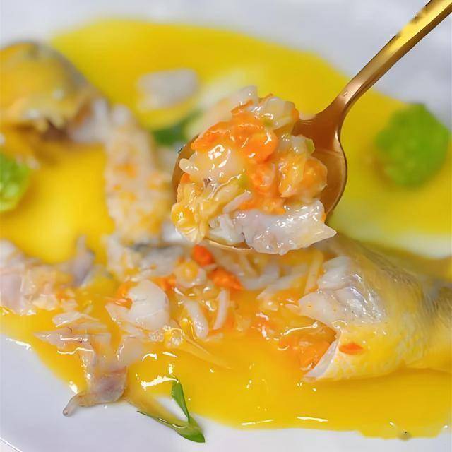 灌汤黄鱼是一道北京宫廷菜,要求将整条野生大黄花鱼去骨但不破皮,填入燕窝、海参等馅料蒸制而成,被称为"腹藏乾坤"。成菜外皮金黄酥脆,内里鱼肉嫩滑多汁,鱼腹中的汤汁浓郁鲜美。