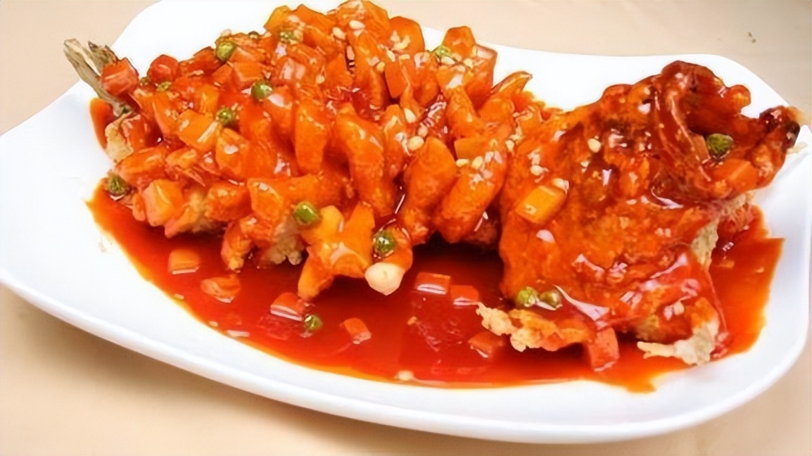 食材:桂鱼200克、 料酒2克、松子10克、胡椒粉少许、番茄酱10克、 植物油500克、湿淀粉40克 、食盐适量、 食醋15克 做法: 1.将桂鱼去鳞、鳃、鳍、内脏,去掉头上的皮衣,洗净,把鱼头斩下,摊开、拍扁。用刀把鱼背部的鱼骨切掉(不要把鱼腹切破),在尾巴处留约1寸的脊骨。桂鱼去骨后,皮朝下摊开,用斜刀切成花刀,刀深达肉的4/5,不要切破鱼皮,在尾巴处开一个口,将尾巴从刀口中拉出。 2.将鱼身撒上食盐、胡椒粉、料酒、湿淀粉(少许)涂匀。 3. 炒锅上火,烧热后倒入植物油,油热至七成,将桂鱼蘸少许淀粉,放油锅中炸数分钟,再将鱼头蘸上淀粉,放入油锅中炸,炸至呈金黄色捞出,将有花刀的一面朝上摆在鱼盘中,装上鱼头。 4.将松子放在油锅中,待熟后捞出,放小碗中。 5.炒锅中留少许油,放入少许清汤,加食盐、糖、番茄酱、食醋,烧沸后,用湿淀粉勾芡,加入热油少许推匀,出锅浇在鱼肉上,撒上松子即可。 葱爆牛肉丝