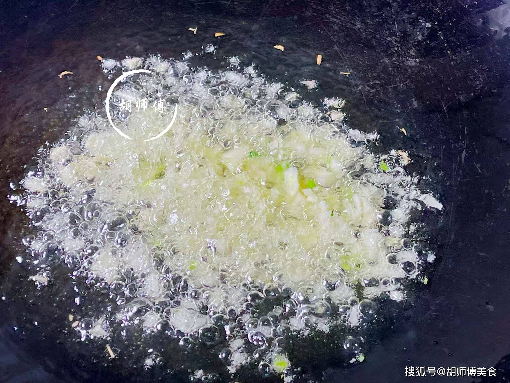 - 热锅放猪油烧至冒烟,下蒜末爆香5秒。
