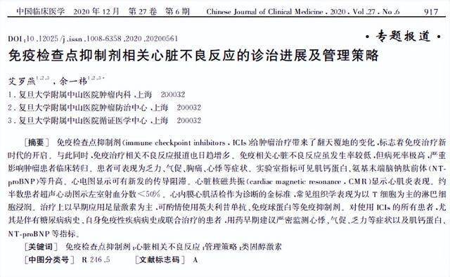 [1]艾罗燕.免疫检查点抑制剂相关心脏不良反应的诊治进展及管理策略, 中国临床医学, 2020-12-24
