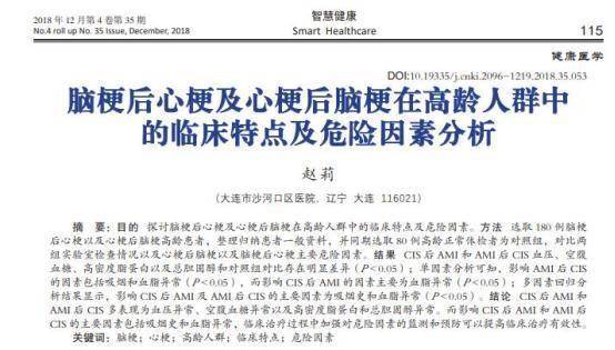 参考资料: [1]赵莉 . 脑梗后心梗及心梗后脑梗在高龄人群中的临床特点及危险因素分析,智慧健康, 2018-12-15