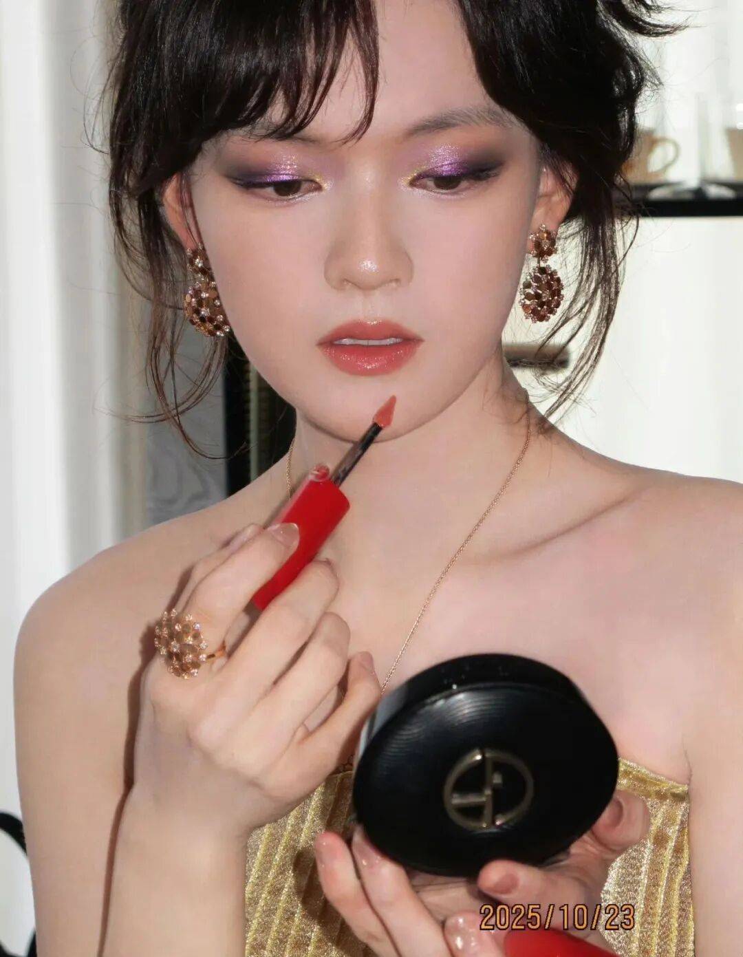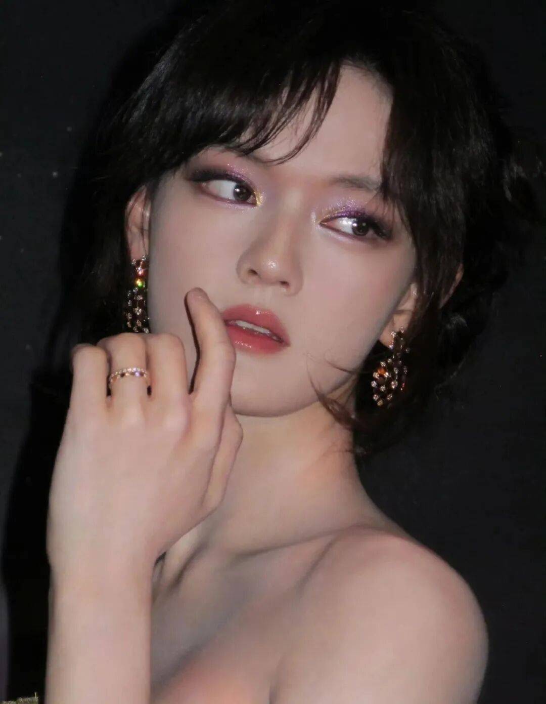 我这次是更喜欢她的妆容,由明星彩妆大师王亚平打造,大胆的紫色烟熏,着重高光,有点千禧年经济上行的复古夸张美,又有一些未来科技感,搭配上略显凌乱的鸡毛头盘发,有一种让人说不清道不明的迷离之美。