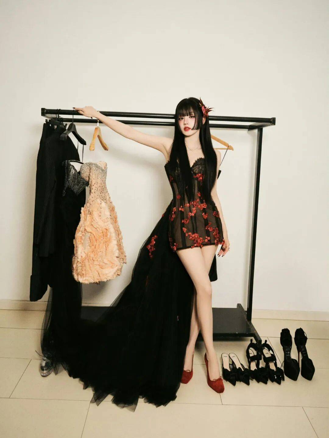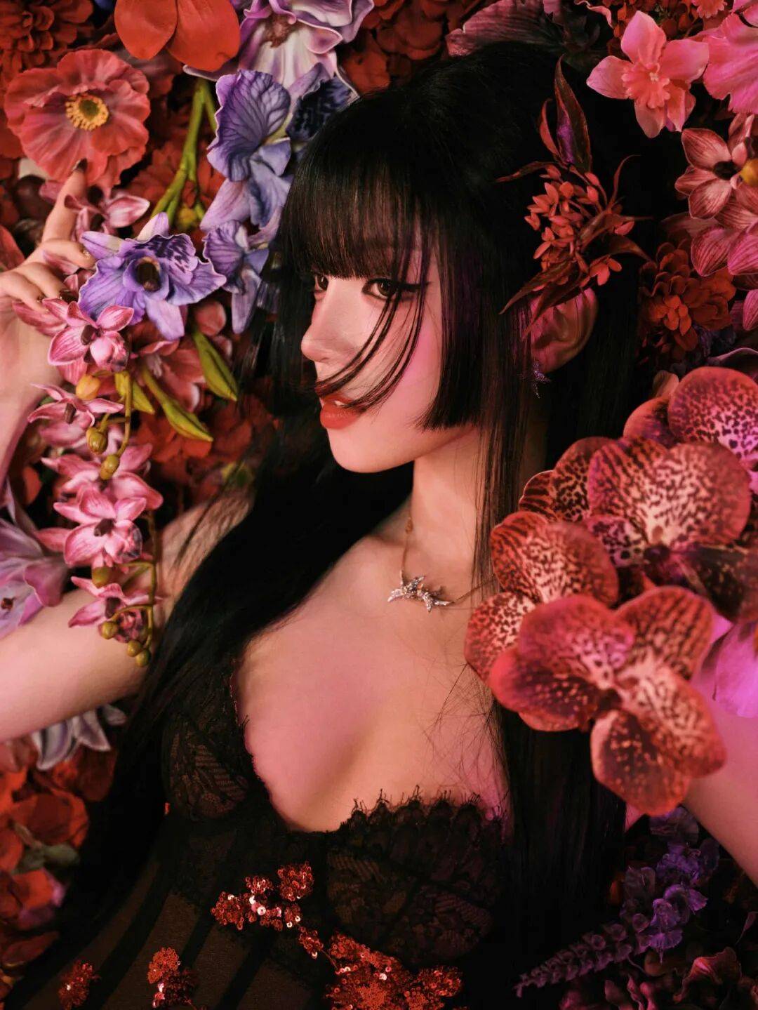 她还有一套走的是那种暗黑富江风,有点二次元的味儿,暗黑系性感女王。