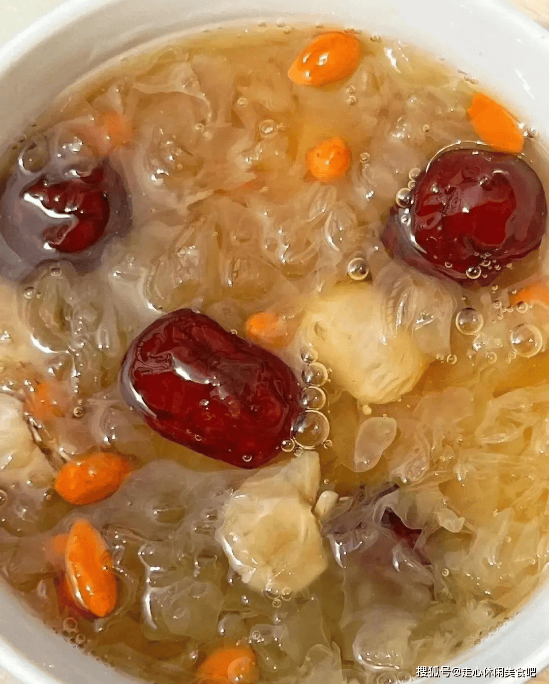 具体做法:准备:银耳用冷水泡发2小时,剪去黄色根部,撕成小朵(越碎越容易出胶)。红枣去核切片。炖煮:将银耳、红枣、桂圆放入炖锅或养生壶,加入足量水(约食材的4-5倍)。大火煮开后,转小火慢炖1-1.5小时,期间不时搅拌,直至银耳软化、汤汁略显粘稠。完成:出锅前5分钟加入枸杞。若觉甜度不足,可趁热加入极少冰糖或代糖融化。