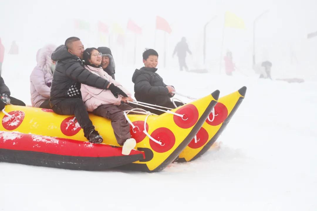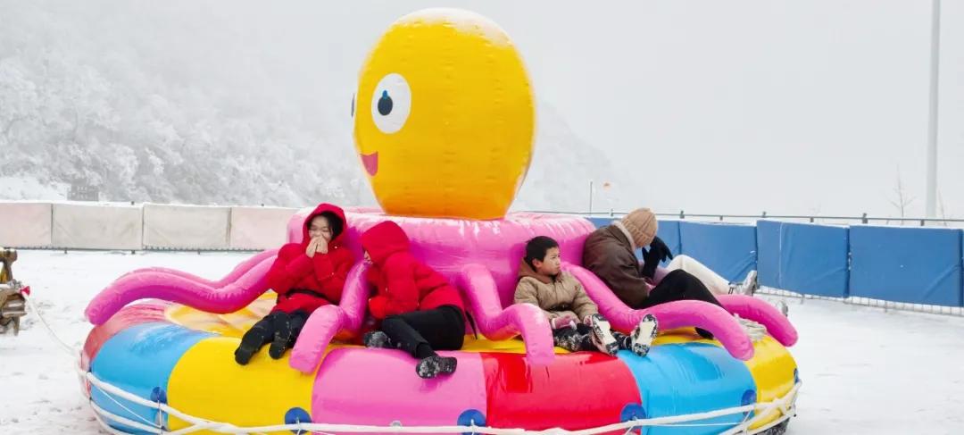嬉雪区内,雪地摩托、雪地坦克、雪地香蕉船、雪地甜甜圈、快乐八爪鱼等嬉雪娱乐项目,让游客们玩得不亦乐乎,欢笑声回荡在整个山间。