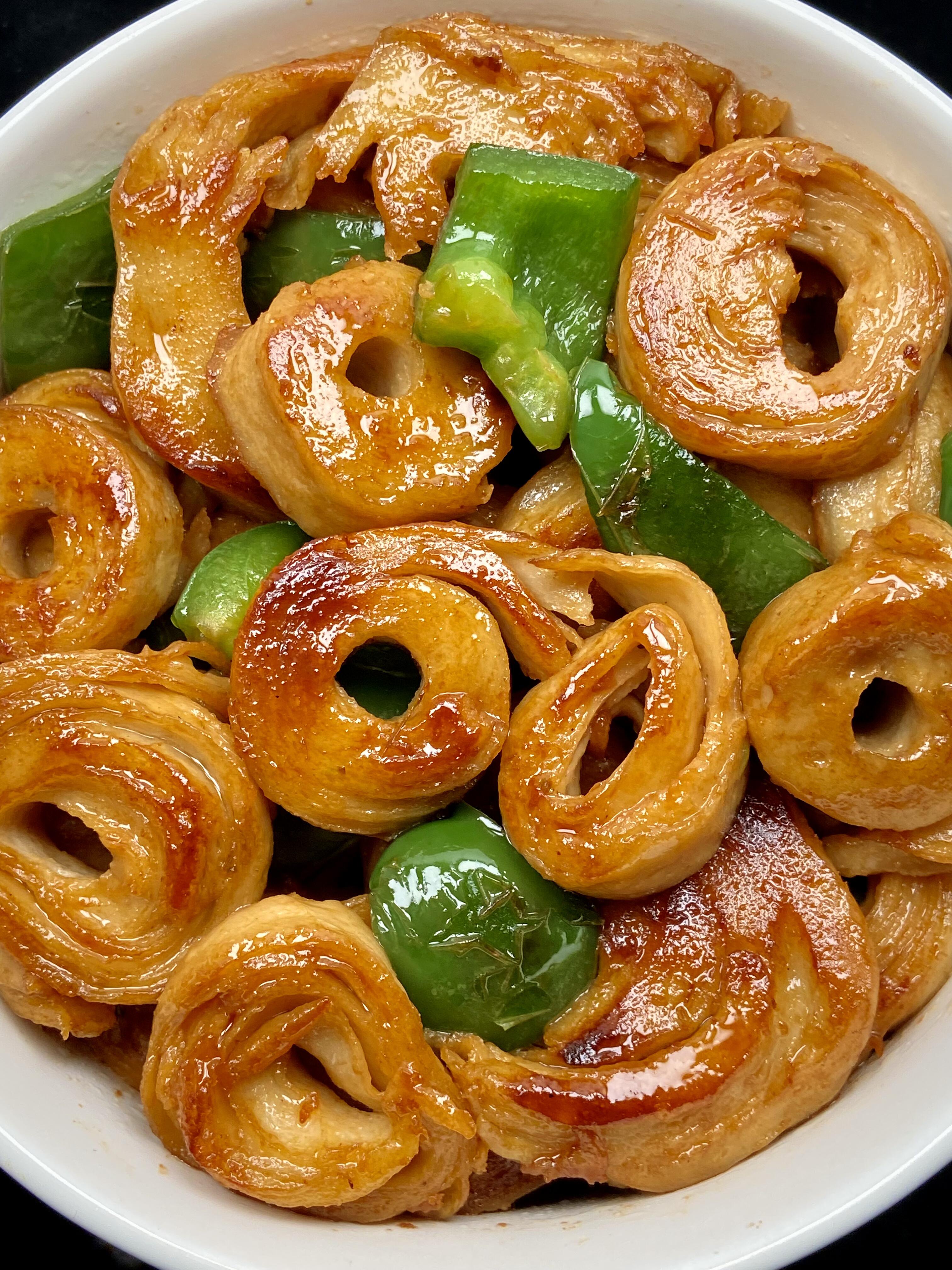 面筋这样做焦香入味,Q弹有嚼劲,搭配青椒清脆爽口,简直美味到爆炸! 口感鲜美爽口,越嚼越香,配米饭我能吃一盘,大人小孩都爱吃,做法简单又美味,大家快来试试吧!