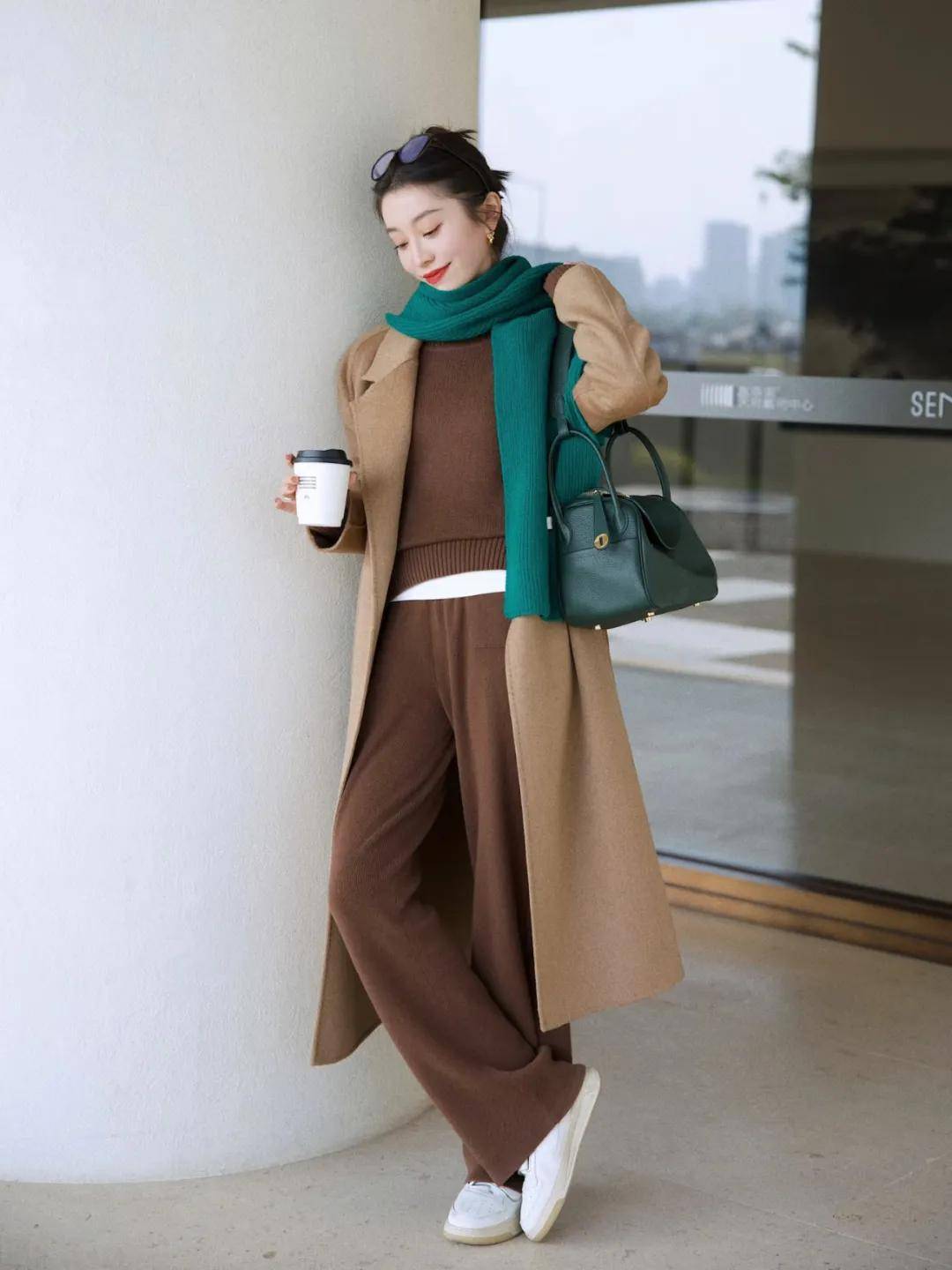 以棕色为主色调的搭配里,加入一条墨绿色的围巾,整体呈现出一种简约而高级的现代感,适合打造极简风格的空间或通勤穿搭。