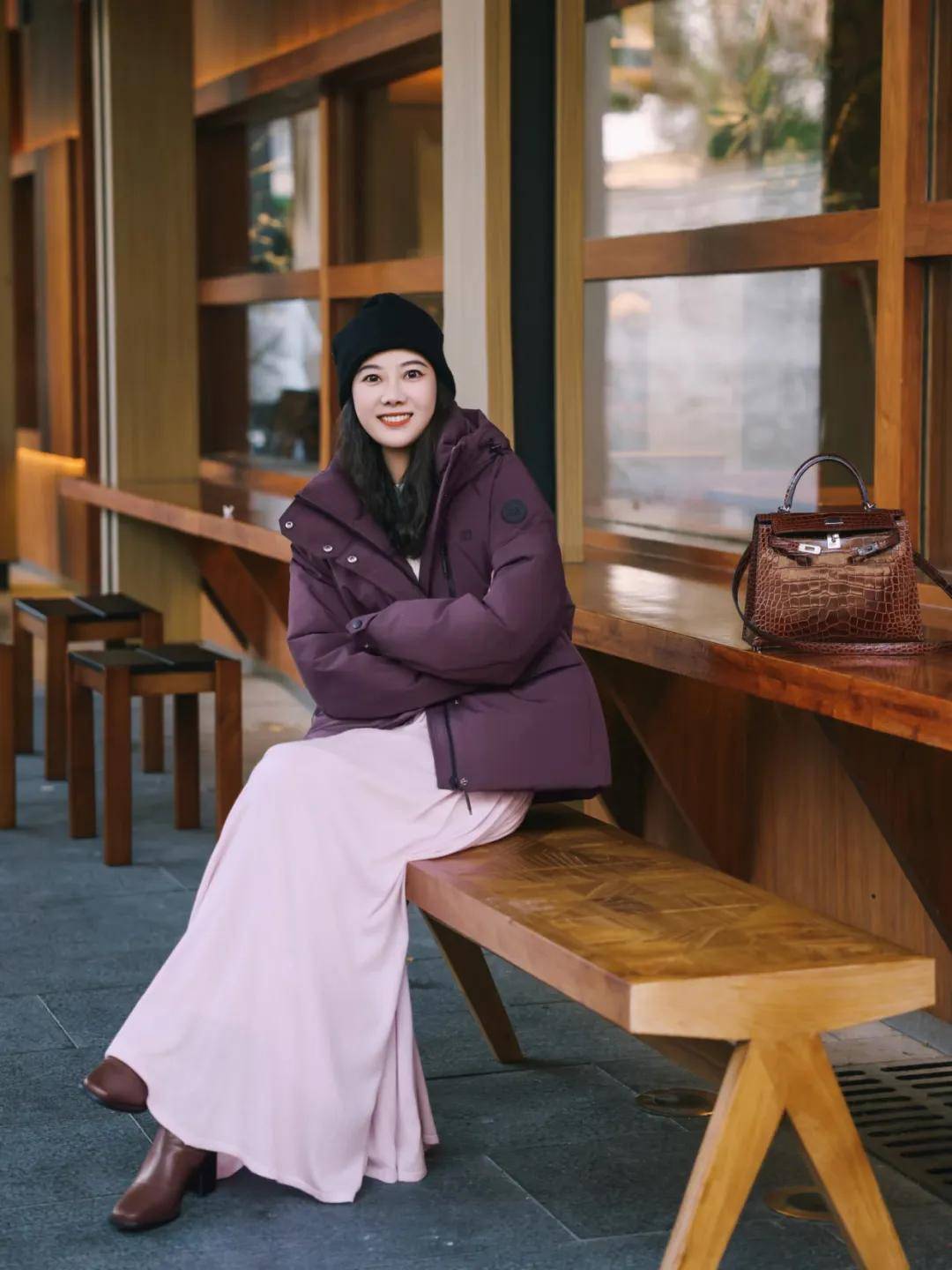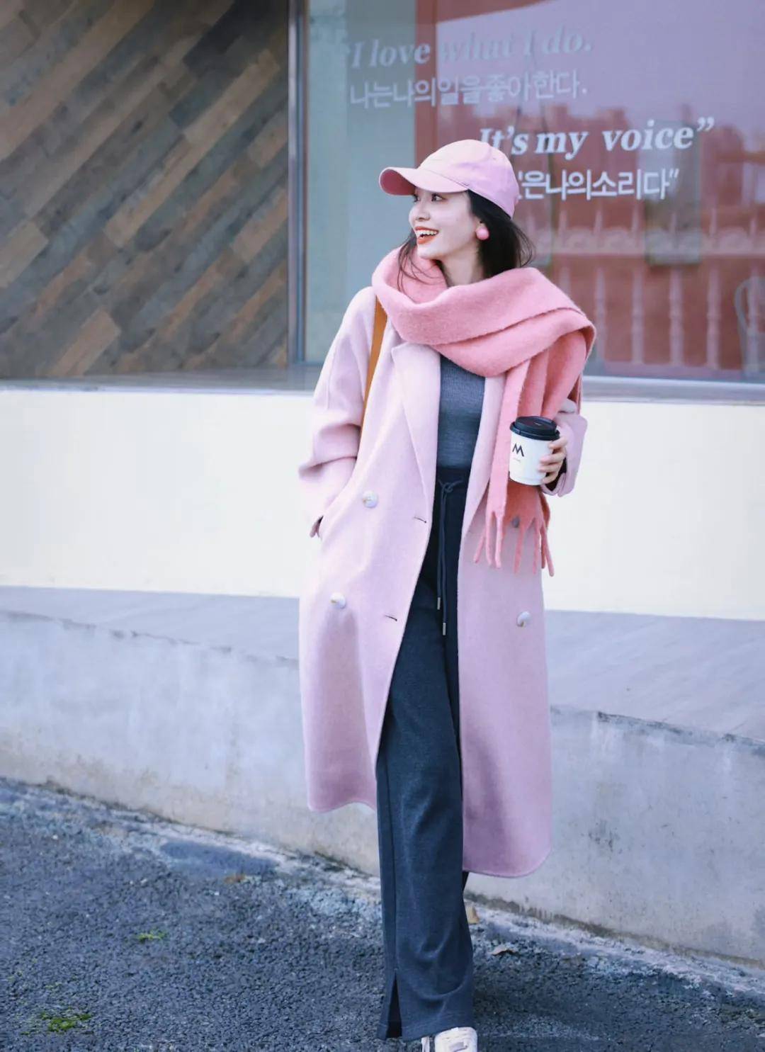 想要显得皮肤白皙有光泽,就把粉色放上半身,或者全身以粉色为主色调,搭配灰色内搭或者裤子,既保暖又能凸显温柔气质。