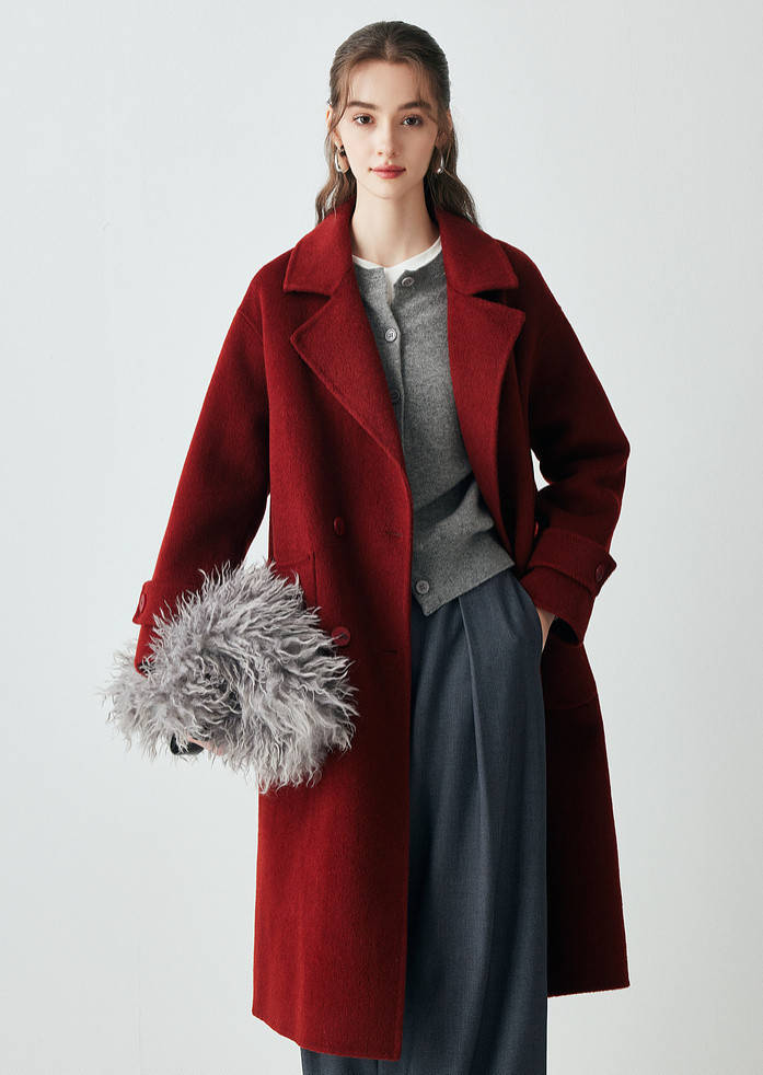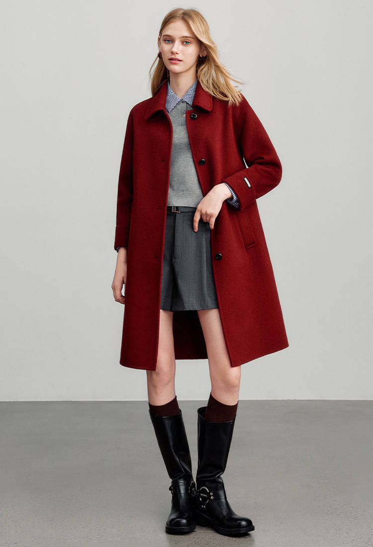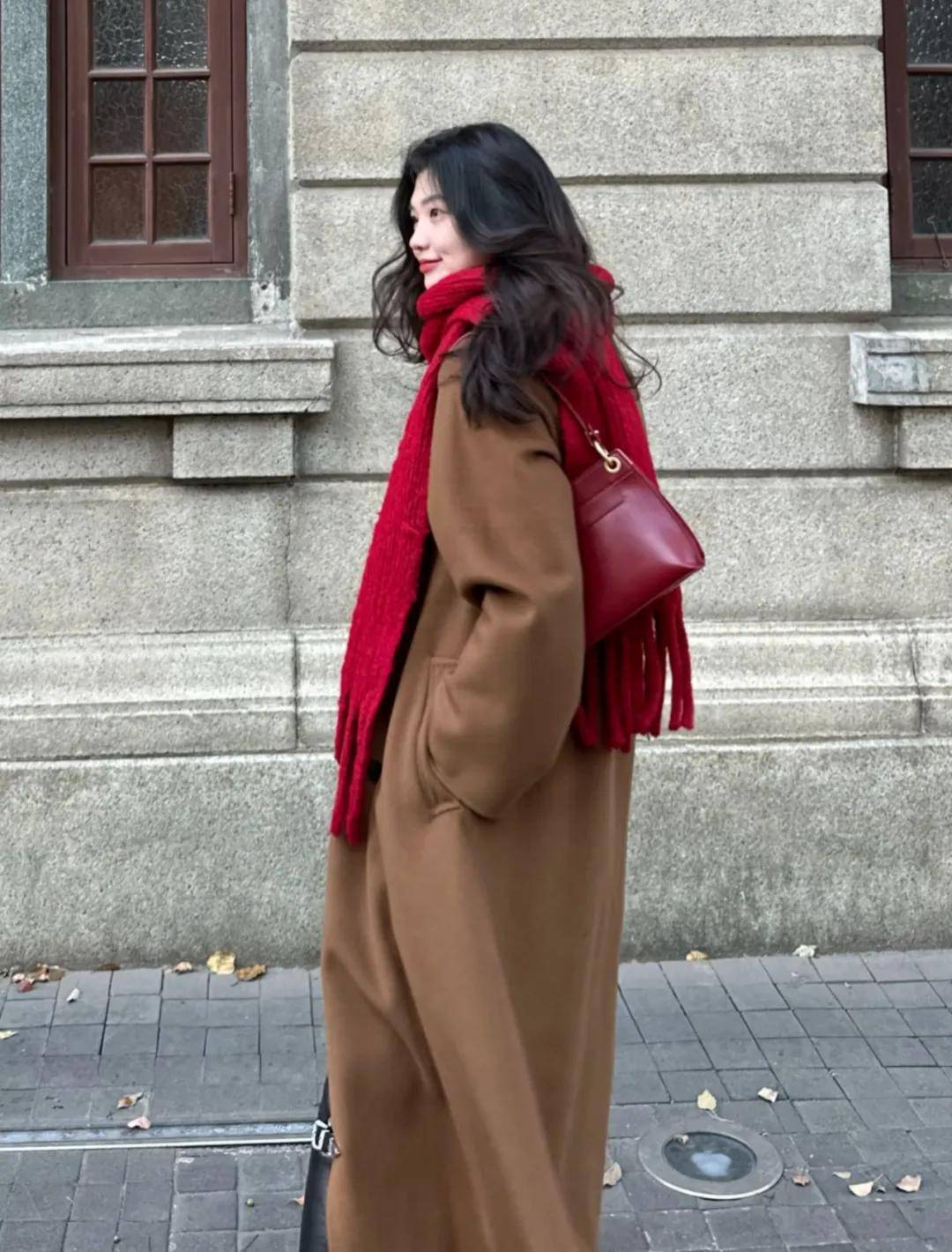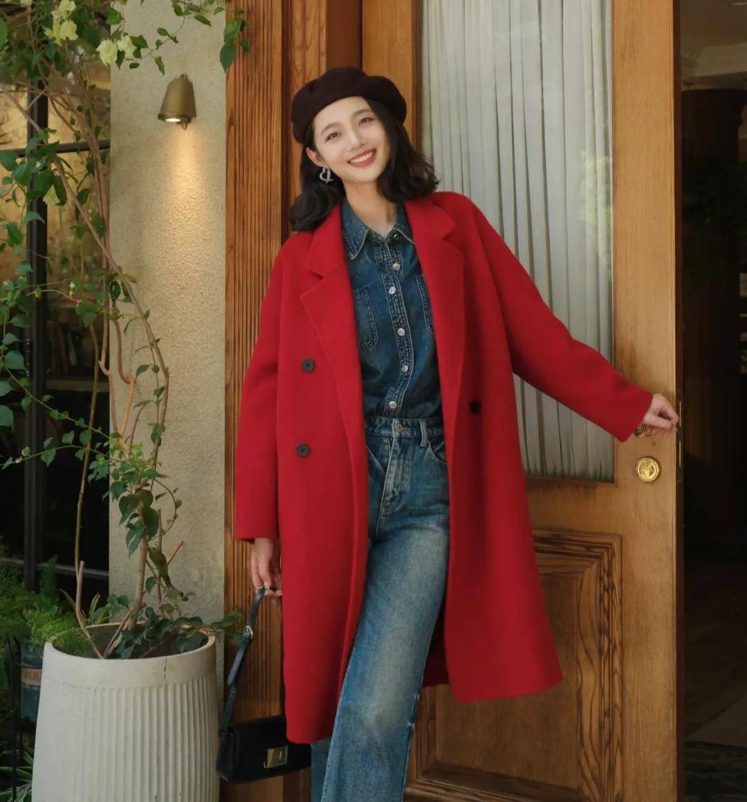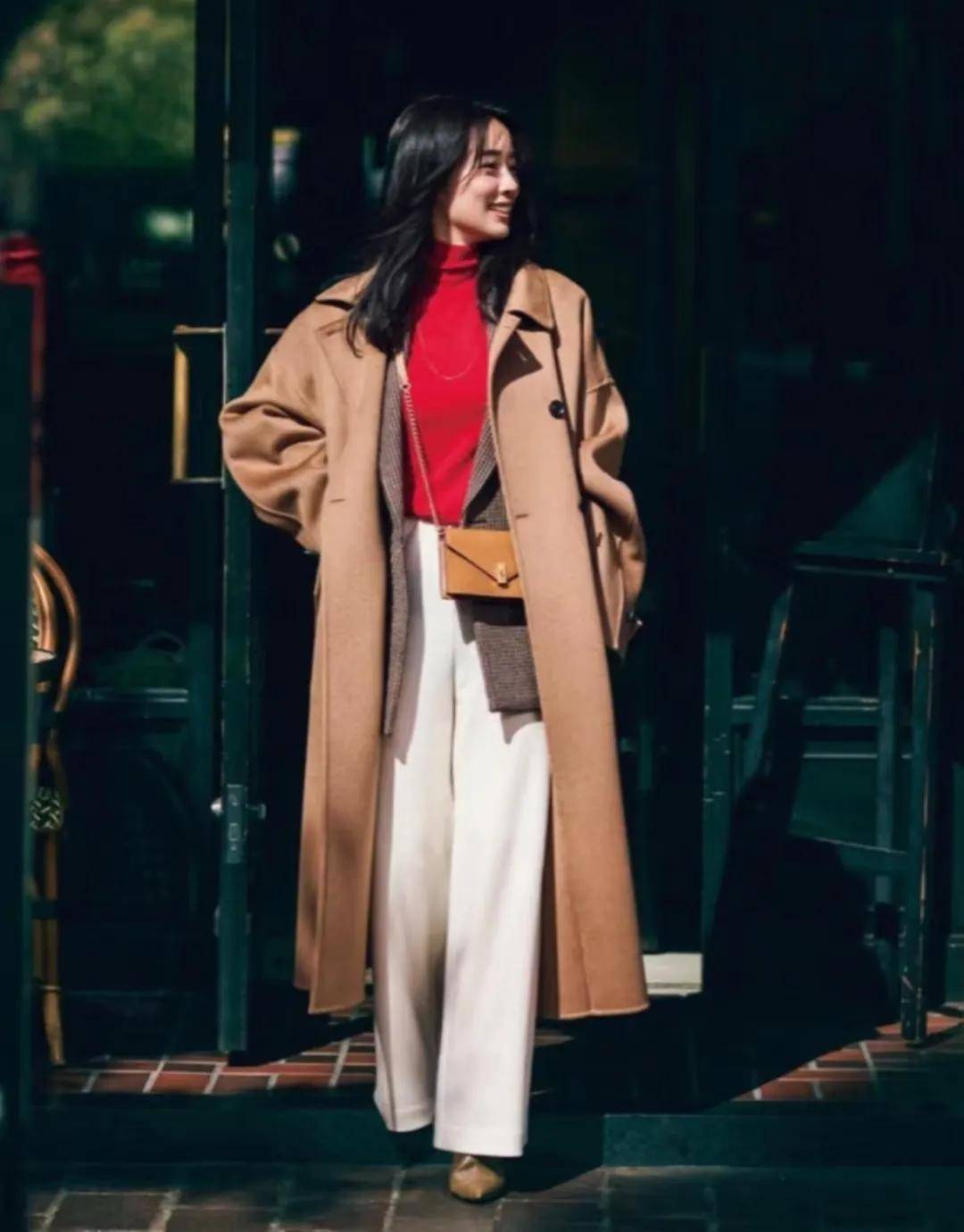 或者在红色的大衣里搭配一件棕色的内搭,既和谐又富有层次感,显得与众不同。