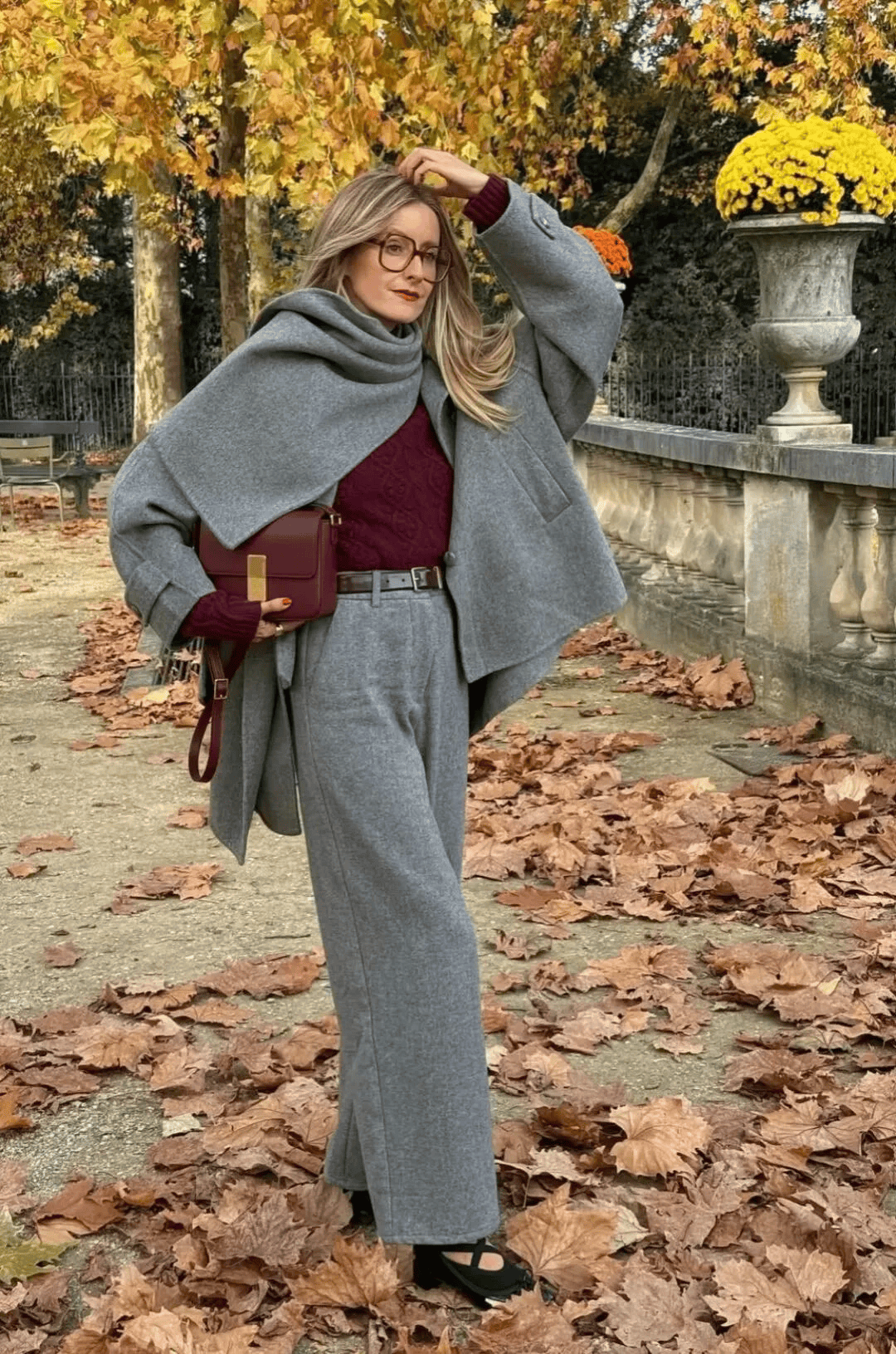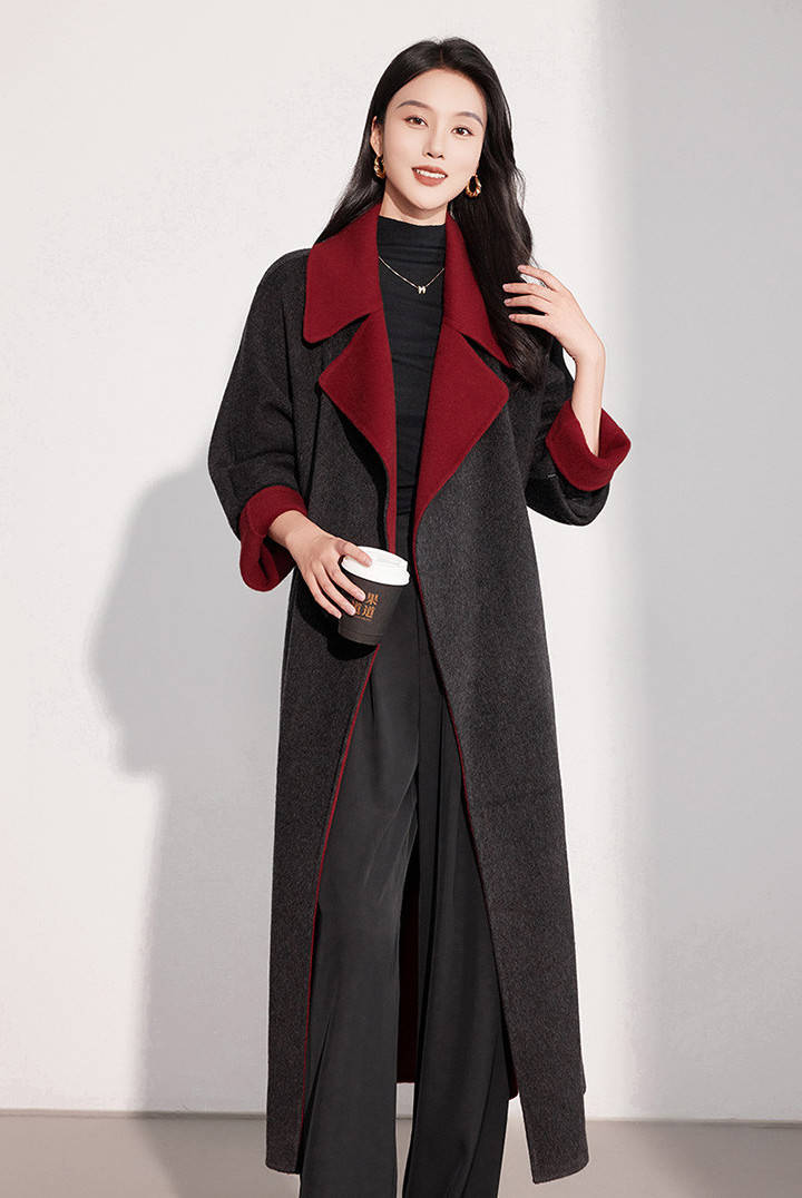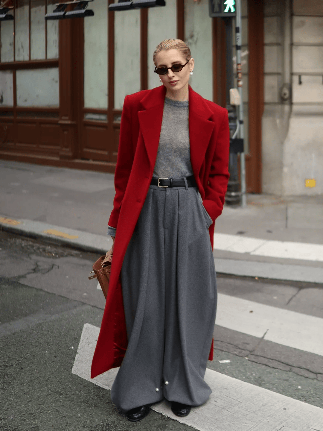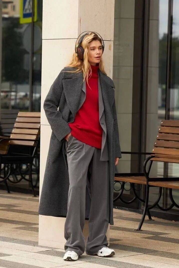 红色廓形大衣 + 灰色阔腿裤 + 灰色打底 ,大衣廓形设计对身材包容性强;灰色阔腿裤垂坠感十足,能平衡大衣的厚重感,还能拉长腿部线条。