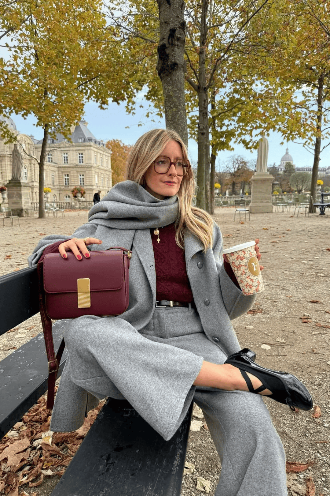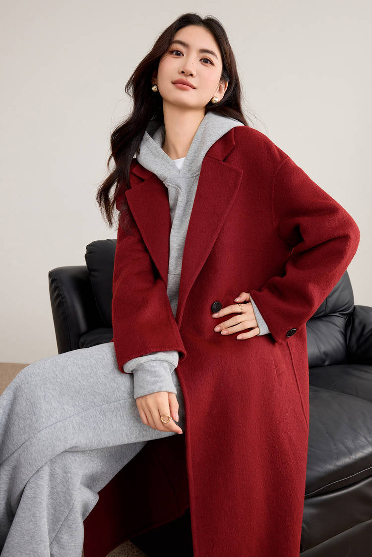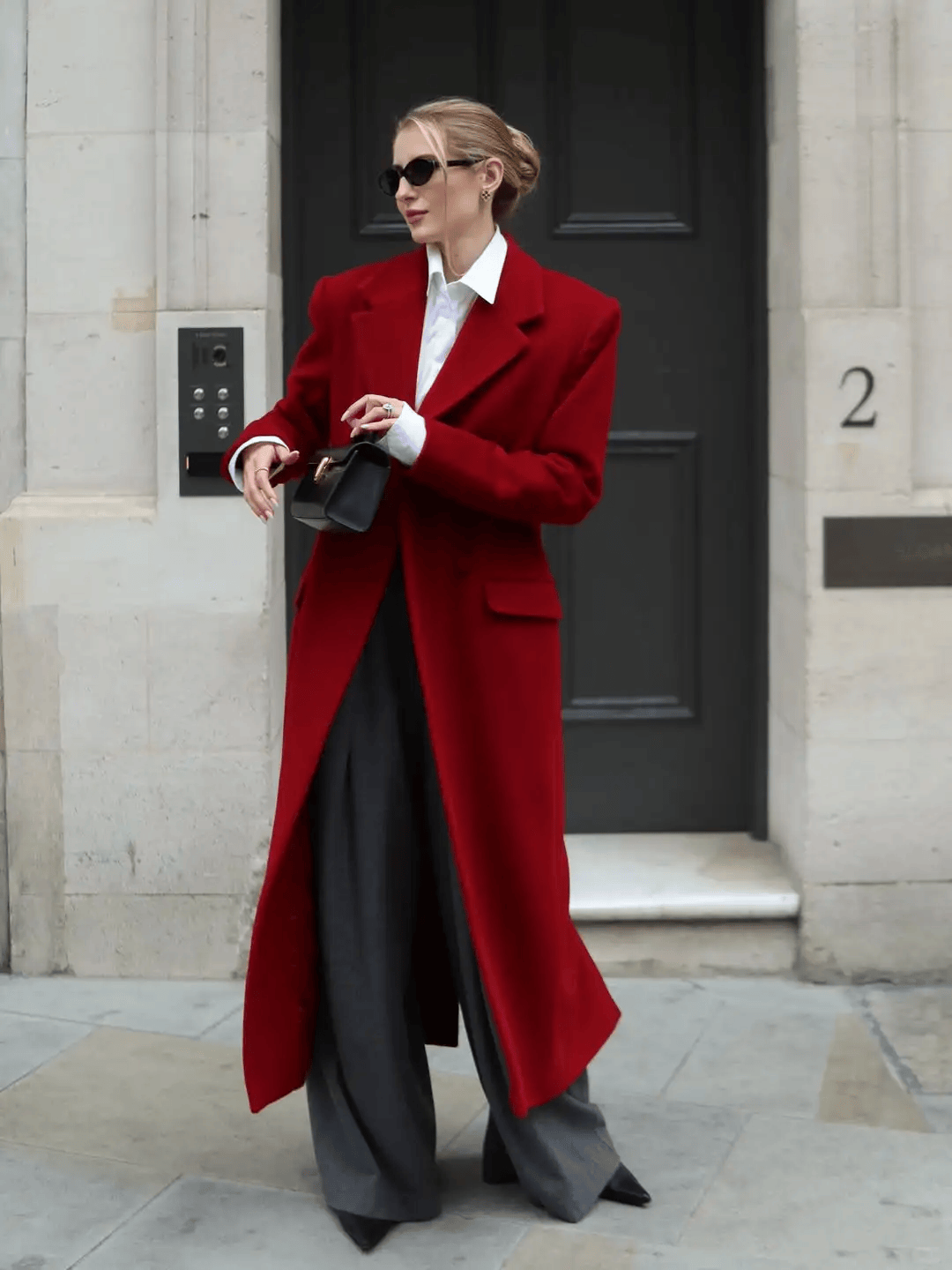 红色廓形大衣 + 灰色阔腿裤 + 灰色打底 ,大衣廓形设计对身材包容性强;灰色阔腿裤垂坠感十足,能平衡大衣的厚重感,还能拉长腿部线条。