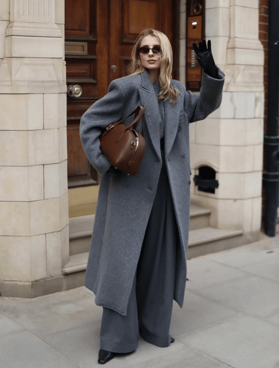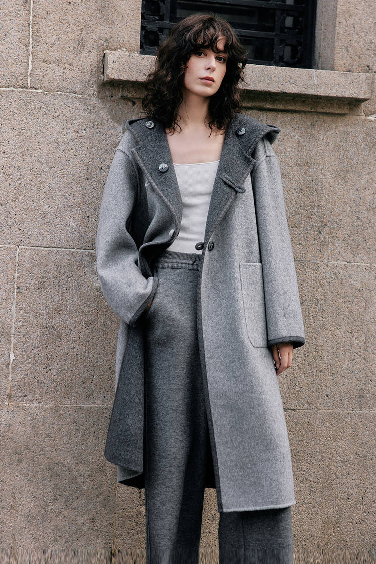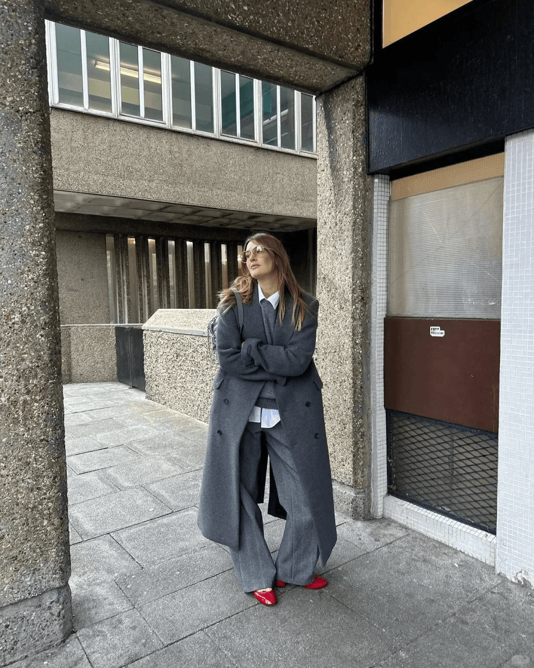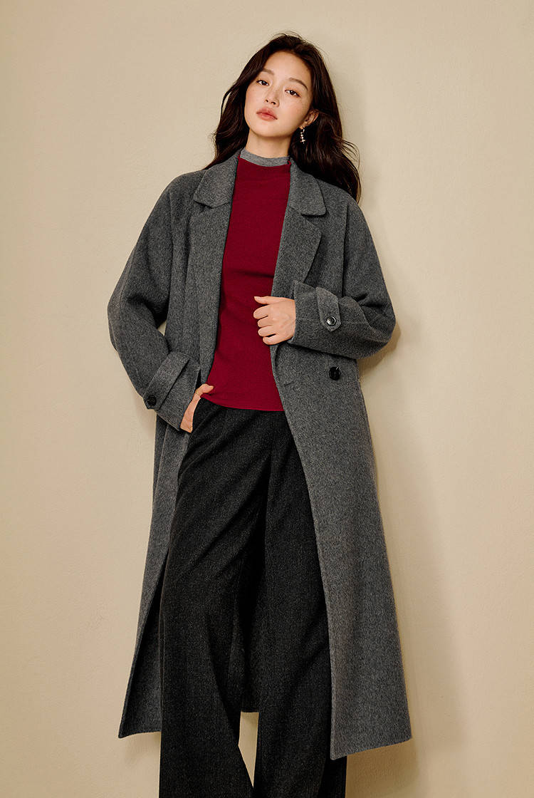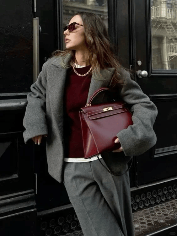 灰色大衣是冬日必备的“高级感担当”,搭配同色系裤子打造顺色延伸,显高又显瘦;红色内搭、围巾或包包作为点睛之笔,不用大面积露肤,就足以提升造型的辨识度,还能呼应冬日的温暖氛围。