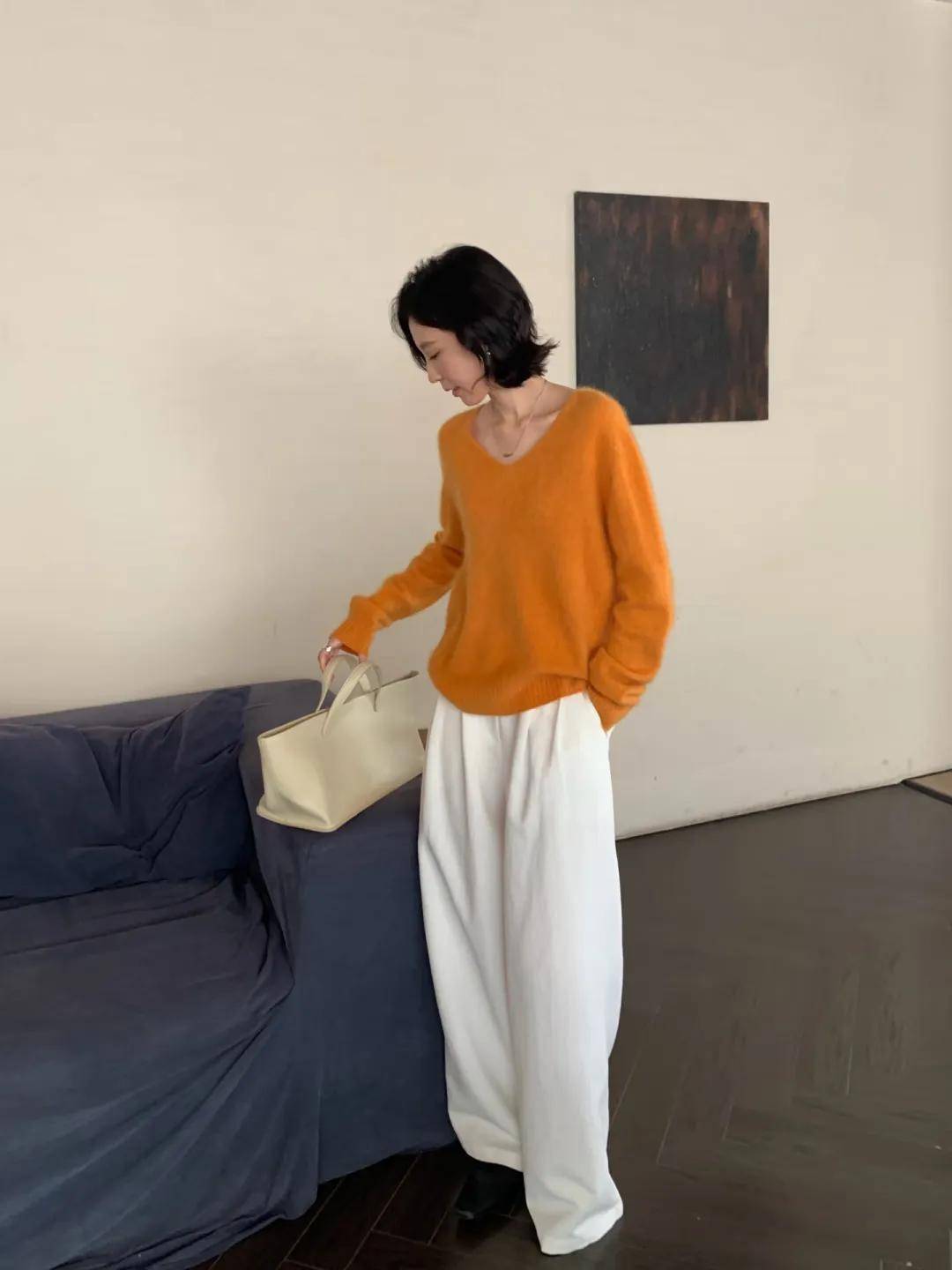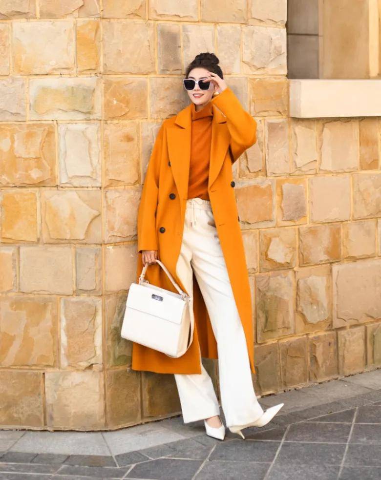 而米白色则相对柔和、素雅,能够中和橙黄色可能带来的些许张扬感。比如穿上一件橙黄色的毛衣,搭配一条米白色阔腿裤或者外套穿一件橙黄色的大衣,让你在人群中脱颖而出,同时又不会显得过于突兀,既彰显了个性,又不失冬日的温馨氛围。