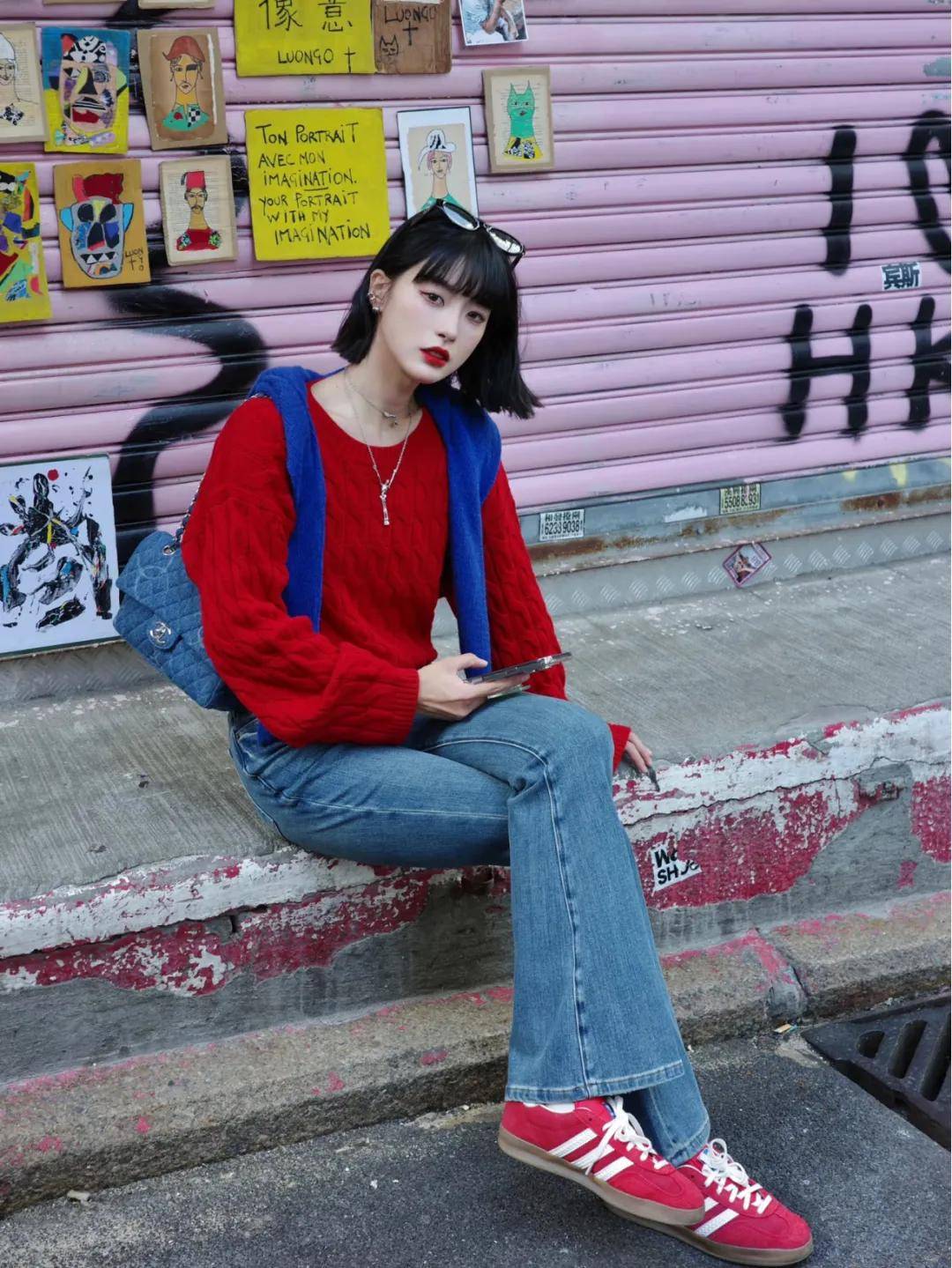 在冬季的穿搭中,采用红色与蓝色相互搭配的方式,可以营造出一种既醒目又充满活力的视觉效果。