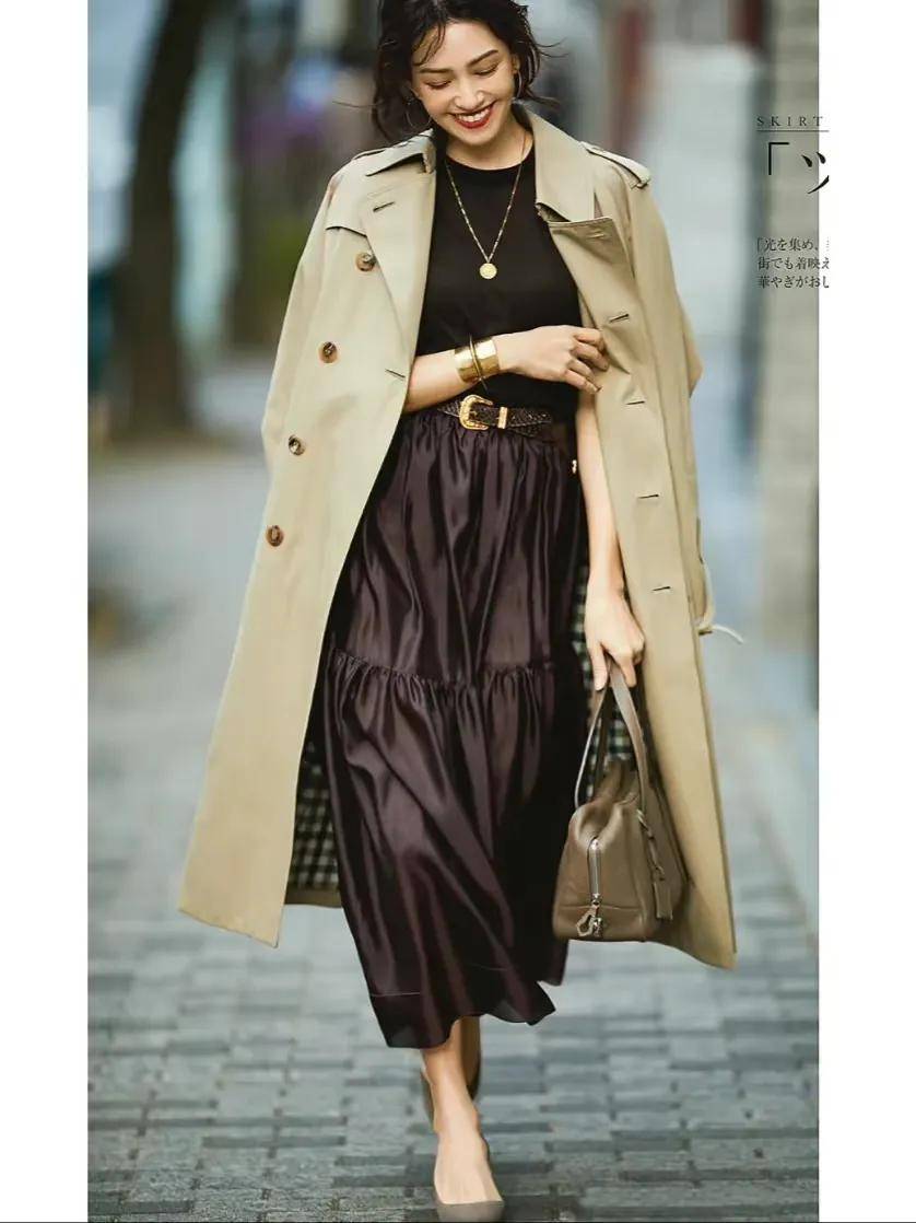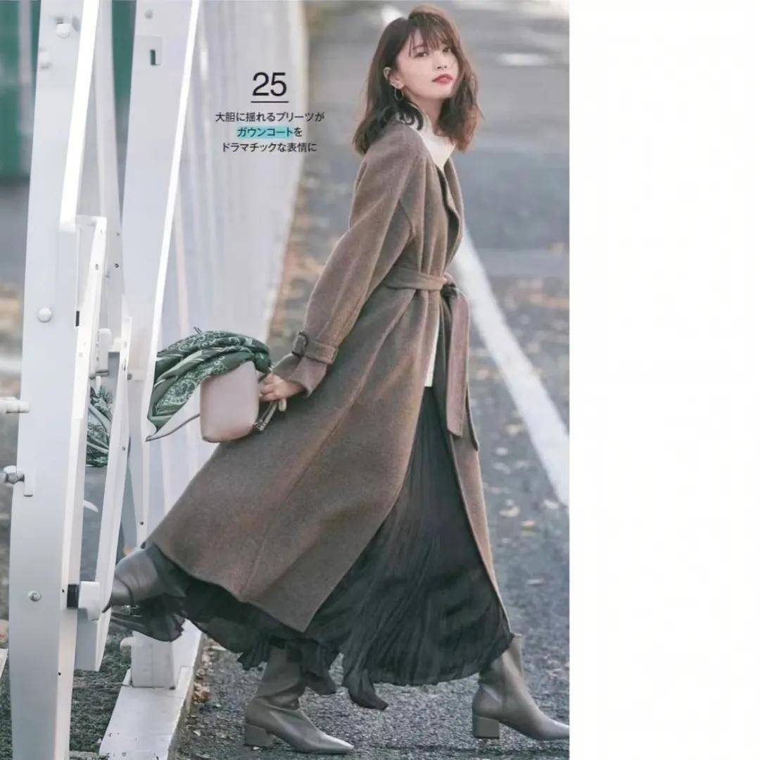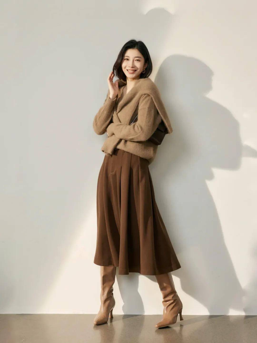 比如卡其色风衣搭配深棕色半身裙,或者浅棕色的毛衣搭配棕色的半身裙,从色彩到风格都和谐统一,举手投足间散发着低调的文艺气息。