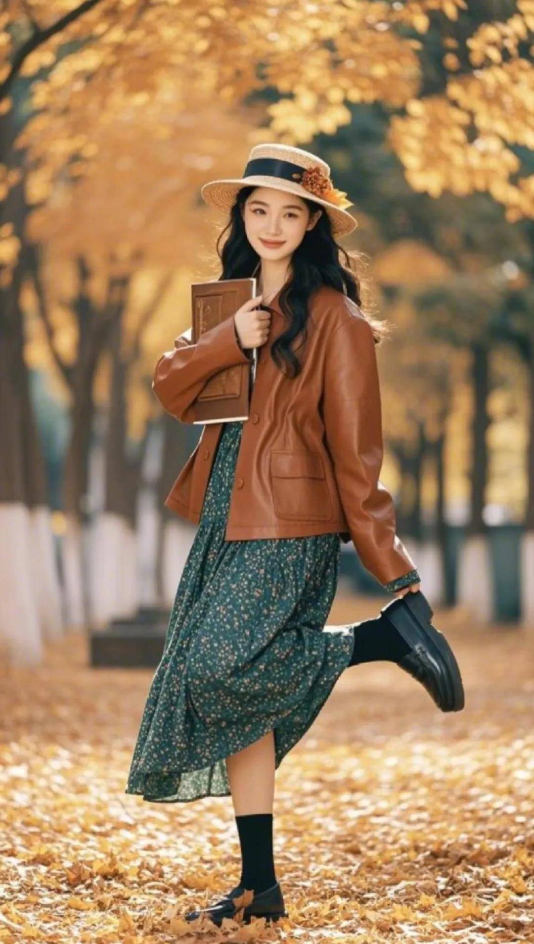 或者穿一件棕色皮衣,搭配一条墨绿色碎花裙,整体造型在硬朗与温婉间找到平衡,自带慵懒随性的法式风情。