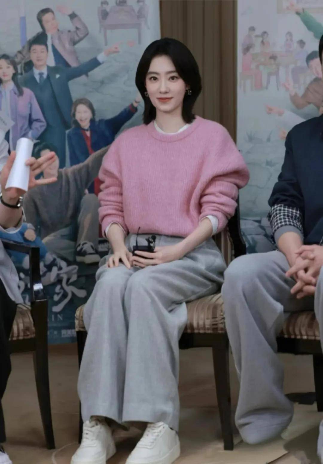 灰色毛衣、卫衣和灰色裤子形成呼应,整体造型亮眼又不失优雅。