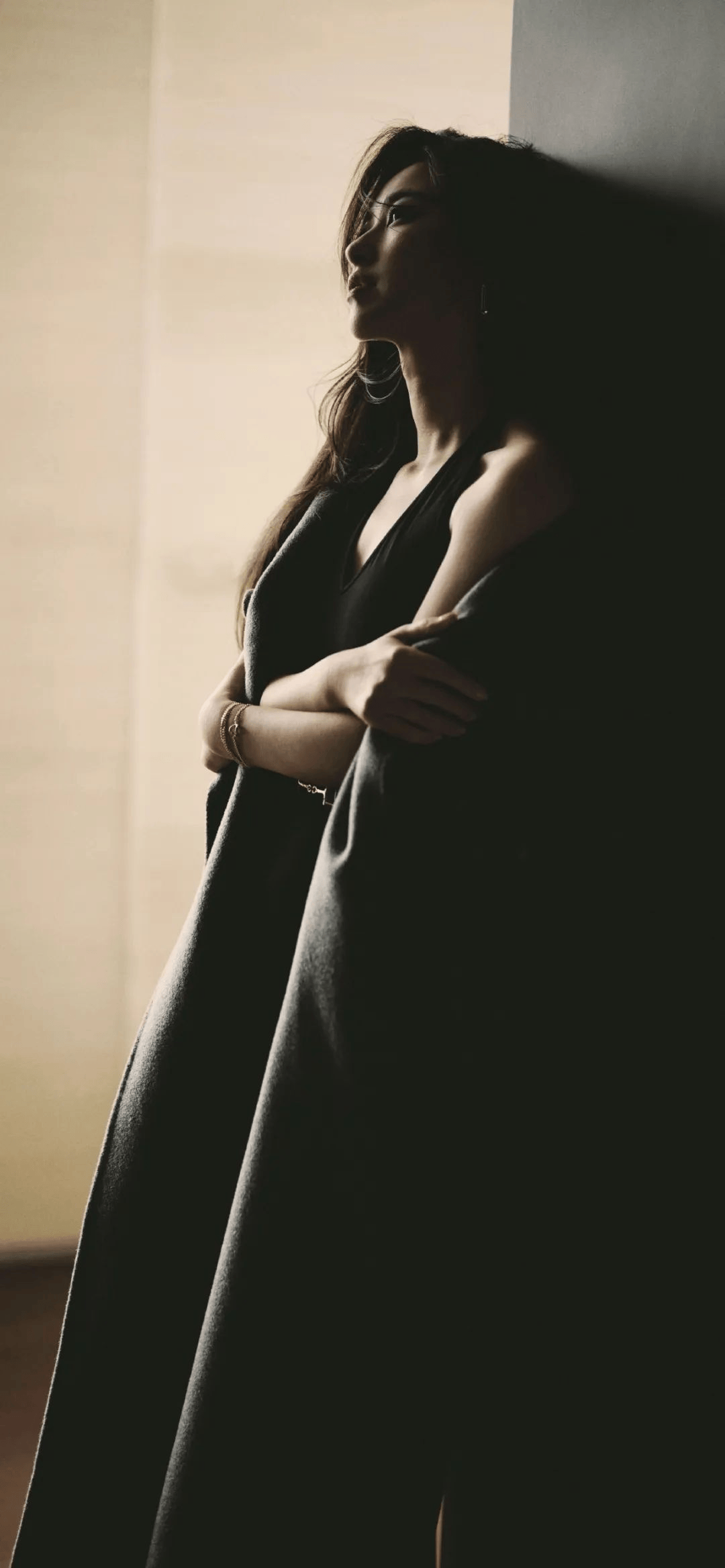 大衣是敞开穿的,有舒适和放松的感觉。领口有拉长视线的效果,有效地修饰脸型,随意不刻板。 这件大衣的面料质感非常好,在阳光下有微微的光泽,自带一种低调的高级感。面料很挺括,垂感很好,走路带风。 一套好的穿搭,不只是在于大衣的款式和颜色,同样重要的,还有内搭: