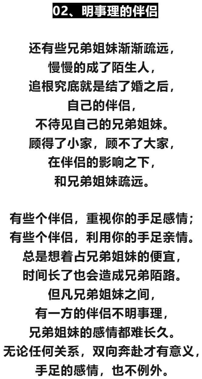 - 对配偶而言:应积极融入大家庭,尊重并支持伴侣与兄弟姐妹的关系,不做“第三者”,而做“粘合剂”。