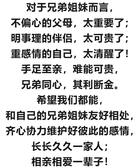 在快节奏的现代社会,兄弟姐妹可能天各一方,各自忙碌。但只要这三方力量能够协同作用——父母奠定良好基础,配偶积极维护,自身主动经营——手足之情便能在岁月流转中愈发醇厚。毕竟,“打断骨头连着筋”,这份血缘亲情是生命中最宝贵的财富之一,值得我们用心呵护与传承。