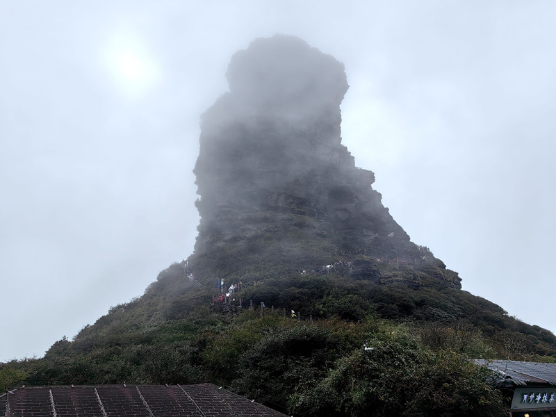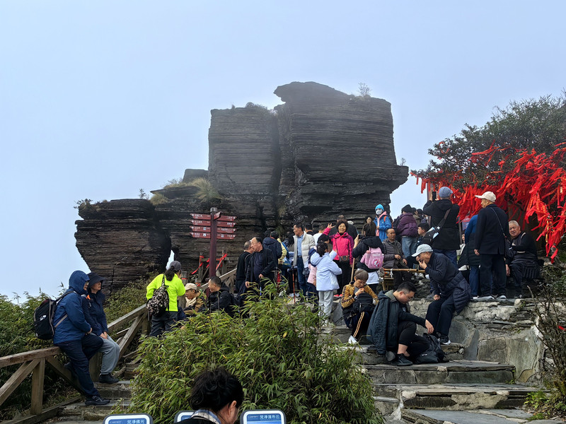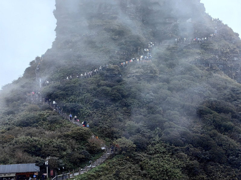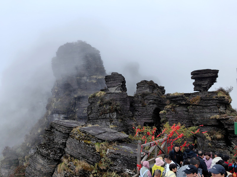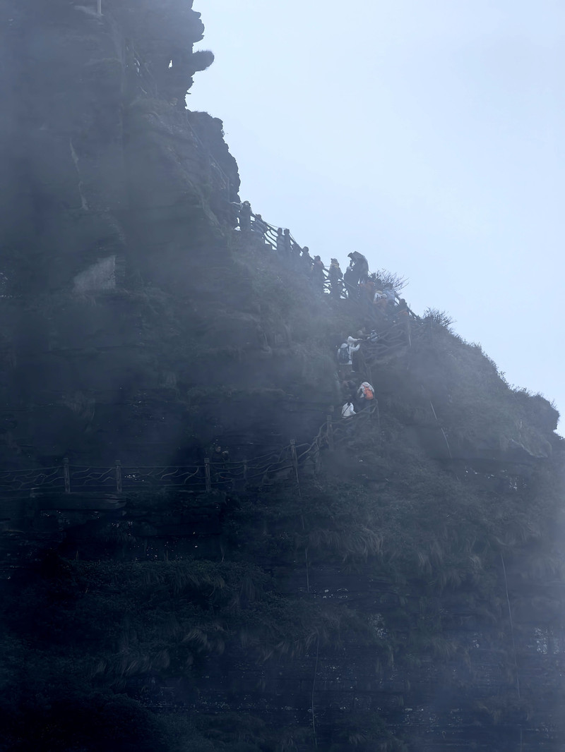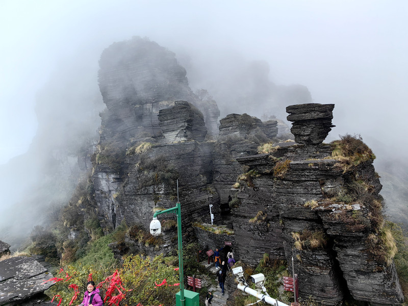从蘑菇石这里有两条路选择,右侧是老金顶,左侧下行路过承恩寺爬红云金顶。老金顶是梵净山的第二高峰,海拔2493米,古称“月镜山”。攀爬老金顶,先经过九皇洞,后走一段较陡台阶和狭窄的“一线天”,有的地方只容一人,手脚并用。因为山上云雾弥漫,根本看不清远处的老金顶和红云金顶。