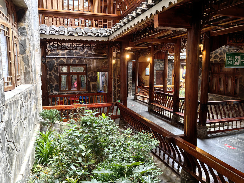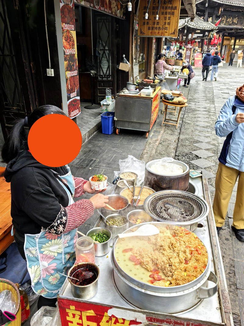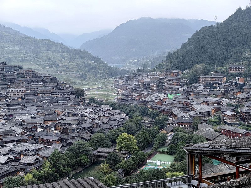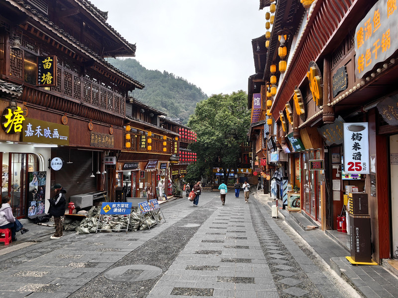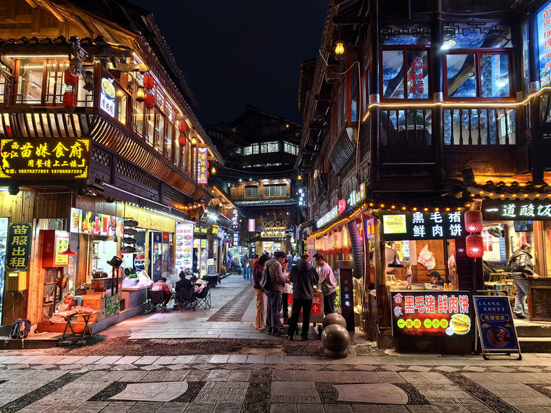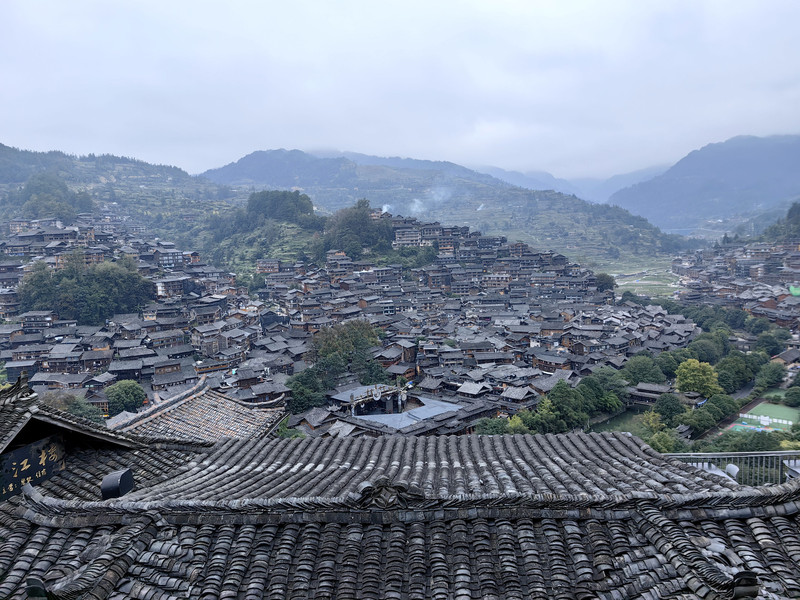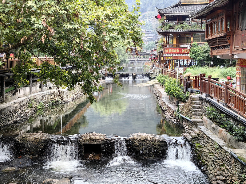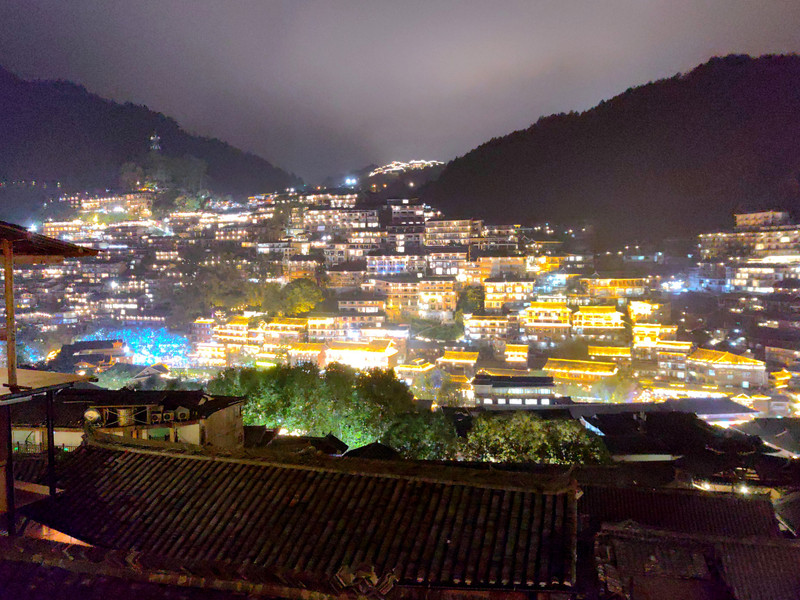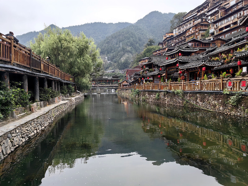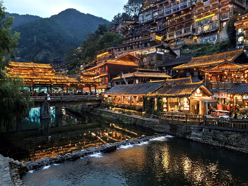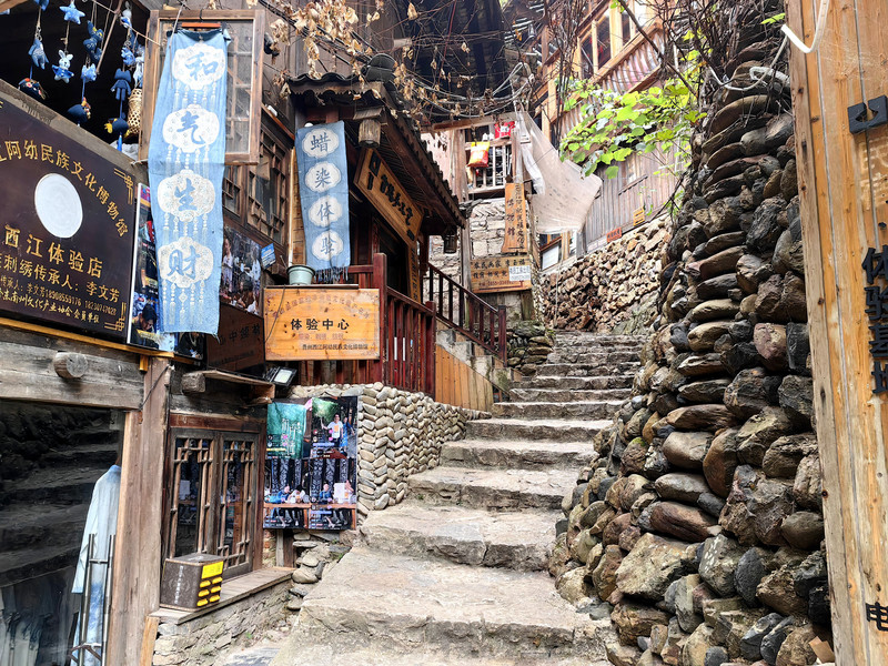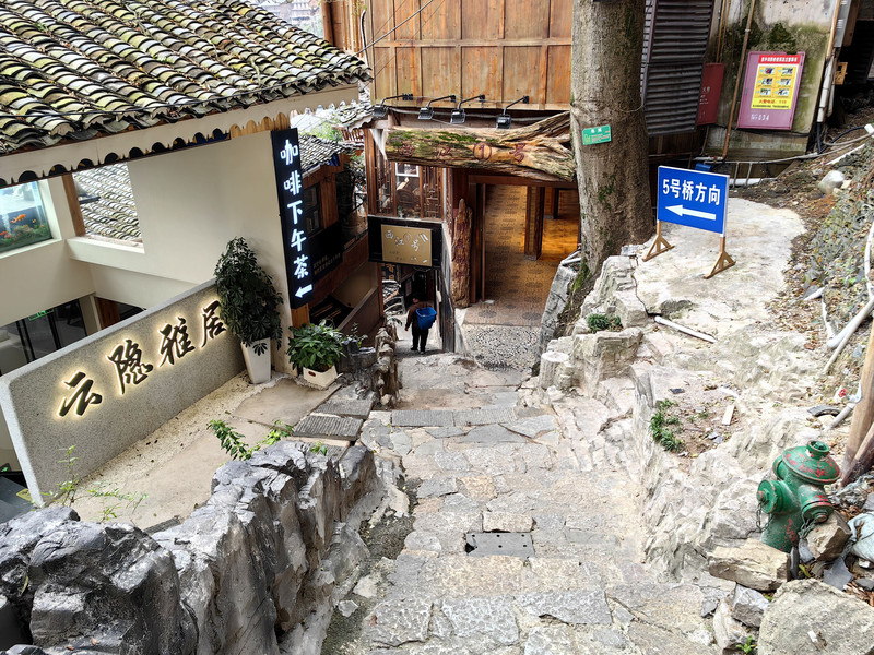 我们从北门坐车到小北门,此前已经与民宿联系,派管家前来接应,管家背着行李带我们去民宿。这里是典型的阶梯式建筑,众多房屋沿山体层递而上。我们顺着商业街行走,两边商业街都是木制2-4层小青瓦吊脚木楼建筑,颇有苗家特色。多是饭店、特色超市等,还有众多旅拍苗服店。前行会有一个岔路,右边是沿河边走,路过几座风雨桥;左边走商业街,最后两条道会汇合。我们走商业街,不久到也东寨小巷,由此到民宿全是向上台阶,大小不一,庆幸没带大行李,走了一百多级台阶来到民宿办理了入住。民宿在半山腰,可看对面山上错落苗寨,景观不错。