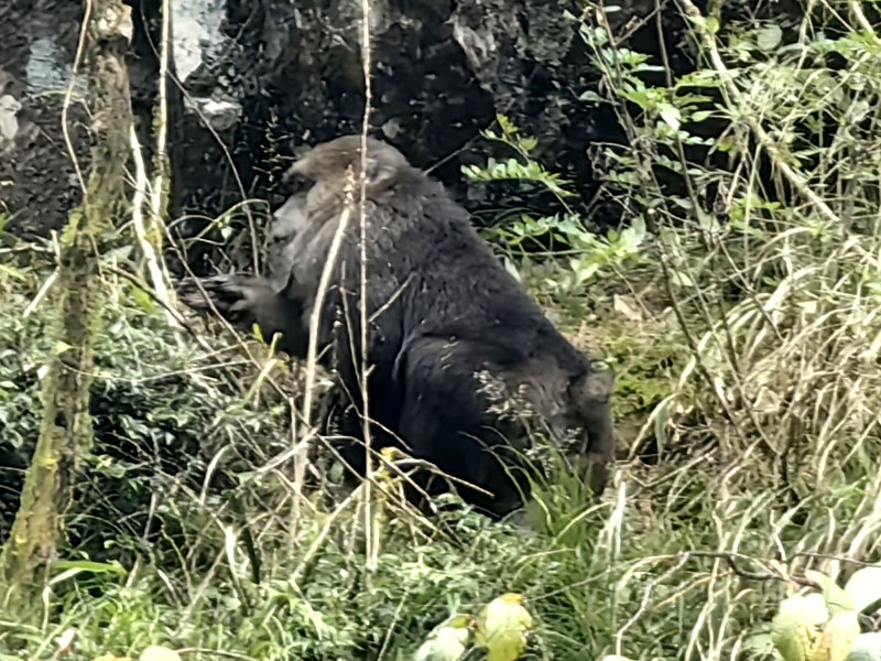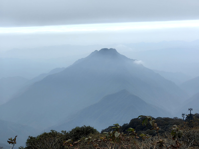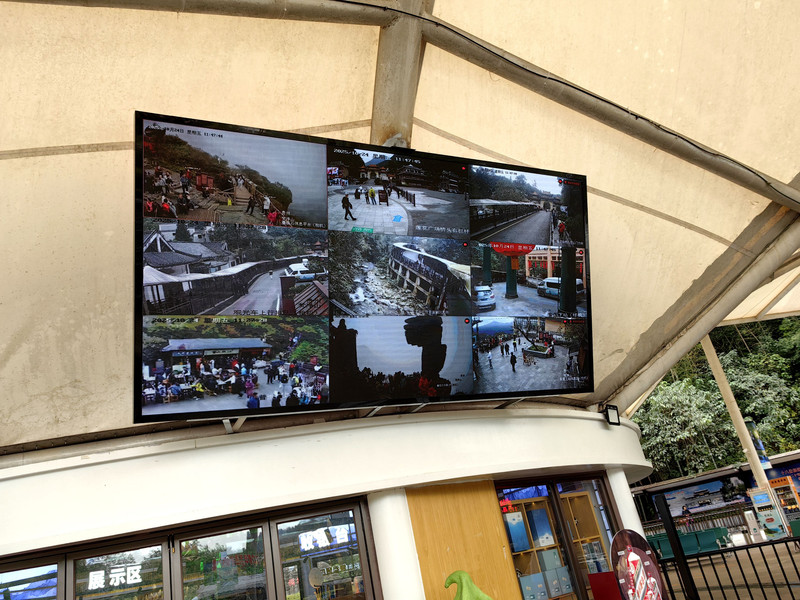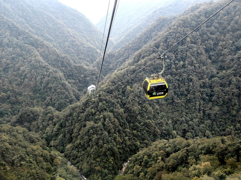 我们到达梵净山东山门(江口县)游客中心后,还是刷身份证,安检后入园。入园前,可以在大屏幕上看到山上蘑菇石、红云金顶等实时录像,还有天气预报。然后走过长廊乘观光车。在长廊里看见身边山上草丛树木间几只猴子跳跃穿梭,吸引游客观看。观光车是小面包车,大家挤坐在一起,车在山道上快速行驶,时上时下。观光车行驶大约20分钟(9.5公里),下车后排队坐索道。如果不坐索道,想要到达山顶,则需要爬将近8000多个台阶,从山下到山上爬山的话,一般需要三至五个小时。索道斜长3411.32米,落差1193米,行驶大约30分钟,一个轿厢能坐8人,行驶速度挺快。索道架在山间,行驶中能看到云雾中层层山峦。