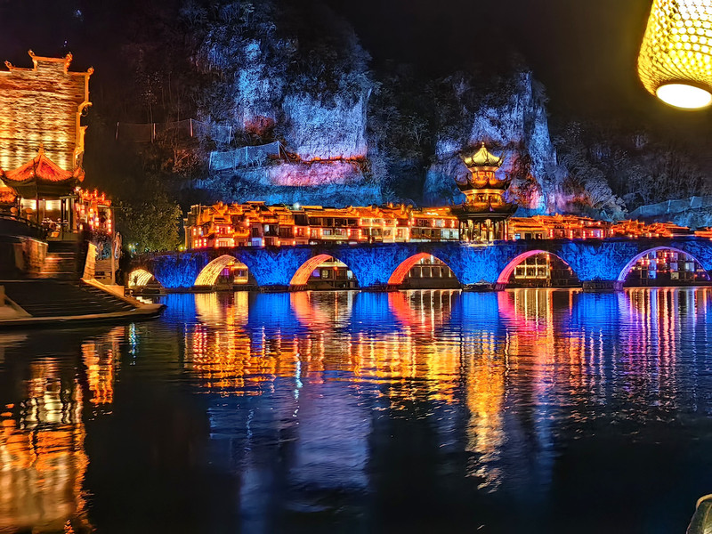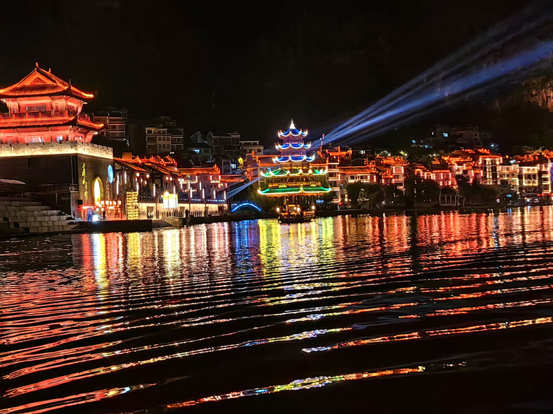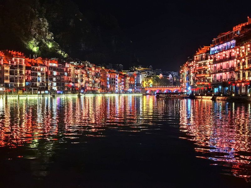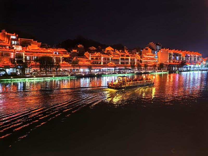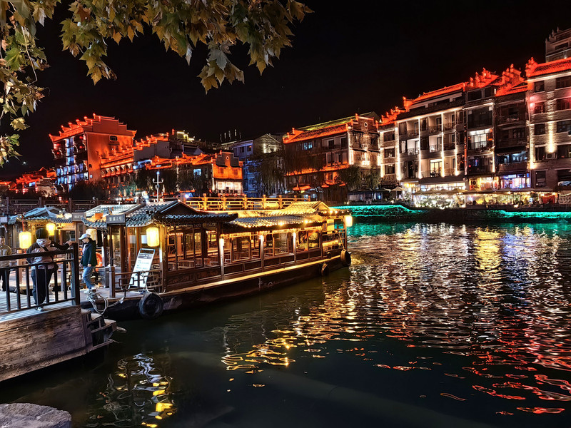 我们乘坐的是9点的船,首先驶向镇江阁。船在河中平稳行驶,两岸建筑被红灯照耀,整体火红,泼洒在河面,河水浸染成红色,泛着波纹,大桥也映在灯光下,格外靓丽。青龙洞的大殿也被灯光照亮,层层叠叠。大家纷纷照相,留住这美好景象。