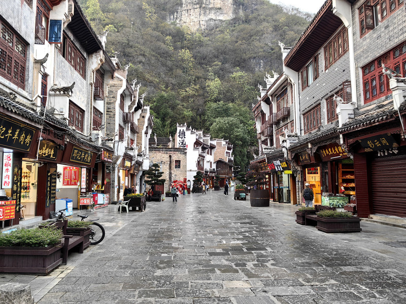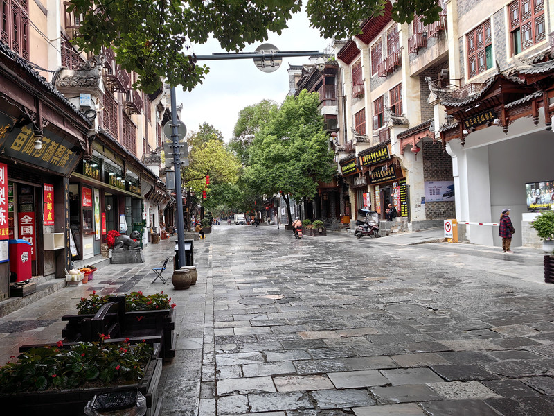 古街石板路,透露着历史的沧桑,古街不长,从两端的桥来测量将近1公里,两侧都是民宿、饭店、商铺、博物馆和一些行政单位。街南侧的商铺都临河,有几个码头。街北侧往上是石屏山,所以里面的街巷不但弯弯曲曲,还要上坡走台阶。北面有许多古巷道,是镇远古镇的腹心,古巷道狭长幽深,其结构错综复杂,有“六牌十巷”的说法。至今遗存七条巷道。