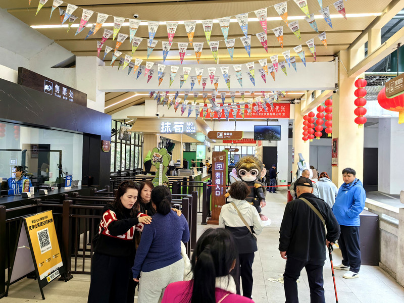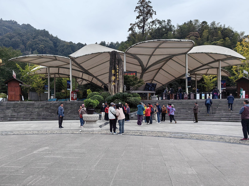 我稍作停留,继续下山,此地距索道站580米,全是下行石台阶。十多分钟后到达索道站,这里免费提供热姜水。我绕到索道站登山地方的咖啡馆与未上山的同伴汇合,一起等山上同伴。此时已经没有上山的游客了,建议大家多带件衣服,登山时热,但停下来阴冷,需套件厚衣服防寒。大约一个半小时后,登顶的同伴们来到索道站,我们一起乘索道下山,乘观光车离开梵净山。