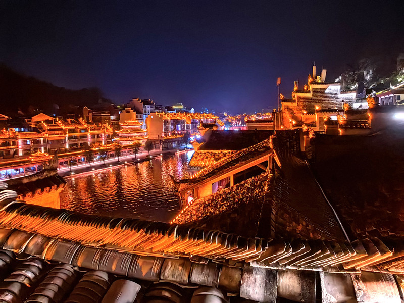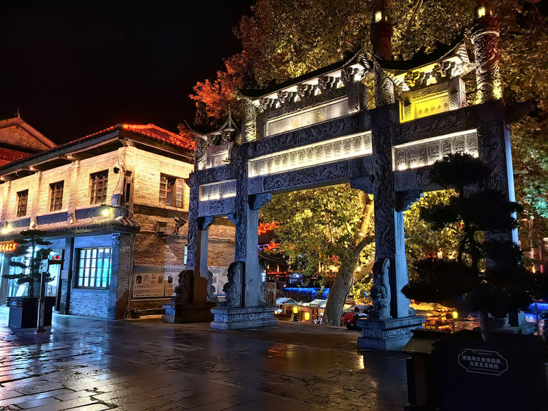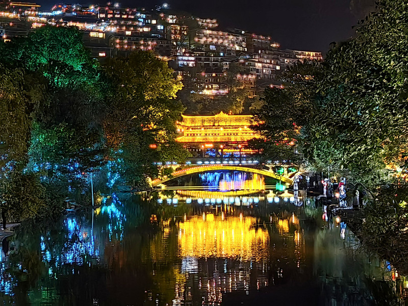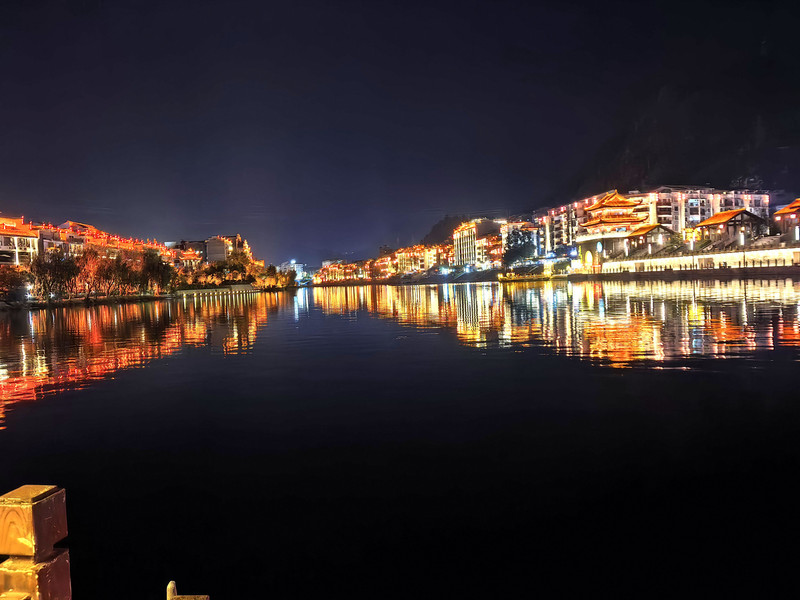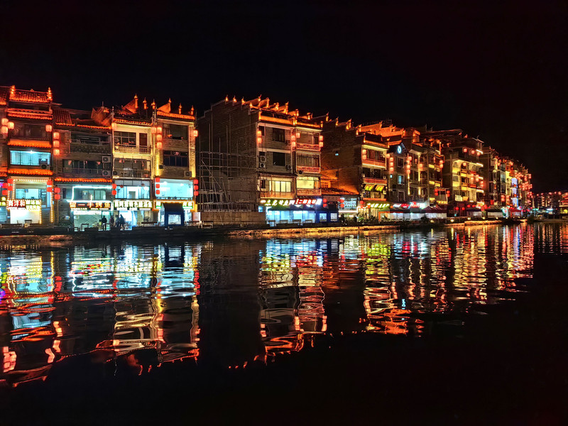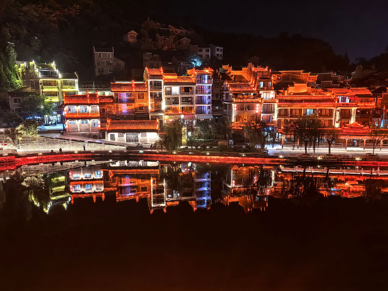 坐在亭子里闲聊,忽然间舞阳河两岸古屋依次点亮红灯,楼体被照亮,串串红灯笼高吊,舞阳河水染成红色。这情景让我想起日本动画片《千与千寻》刚开头小女孩找父母时商铺依次亮灯的片段。