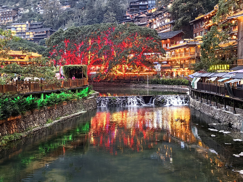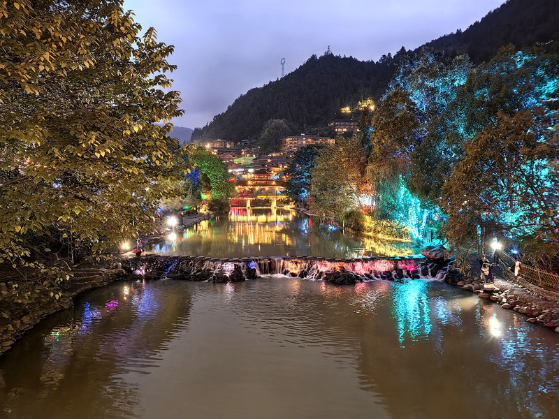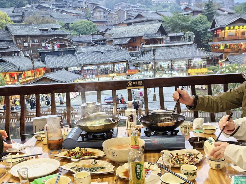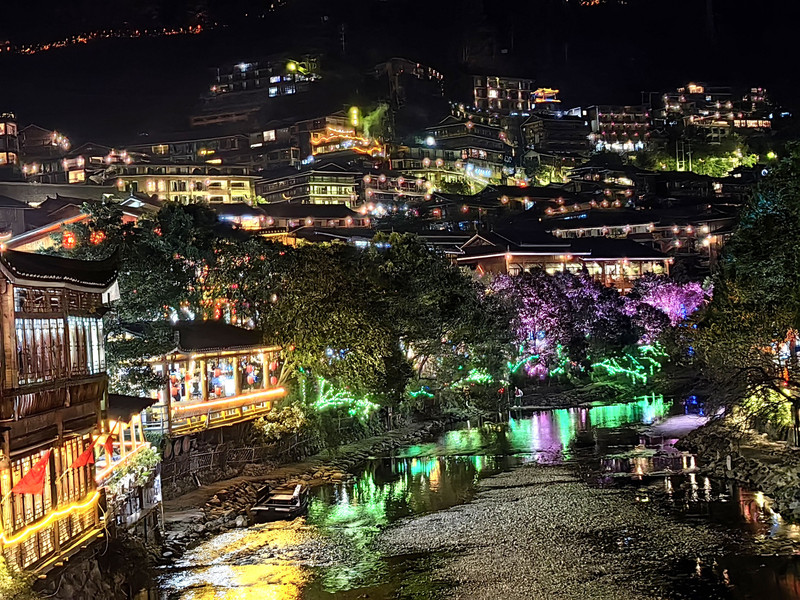 夜晚的苗寨景色最美,我们大家又不想再爬一百多级台阶回酒店,就在河边找了一家饭店,上三楼临窗而坐,喝茶闲聊,静等华灯初上。对面山坡的几家古屋的露台上,不断有人身着苗服旅拍,我们是他们的背景。天色将晚,各处灯光逐渐亮起,万家灯火,层层叠叠,古寨成了灯的海洋。我们叫了一桌菜,边看美景边品美食。