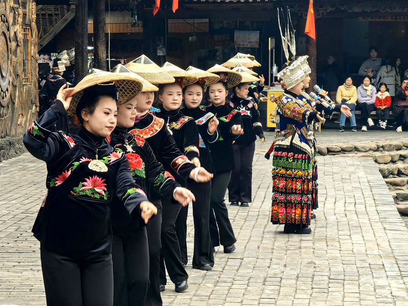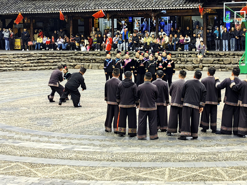 我们稍作休息,又从小巷下来,沿街闲逛。今天没有阳光,天气阴冷。没几分钟来到西江苗族博物馆,由六栋单体上下两层混泥土和吊脚木楼,用美人靠休闲长廊连接成为一个整体的盖小青瓦建筑,共分为前厅、历史厅、生产厅、服饰银饰厅等11个厅,从物质和精神两方来展现苗族古老而又博大精深的文化,内容涉及迁徙、稻作、社交、文化及其相关的节日、衣食、住行、健身、娱乐、意识形态等。博物馆出来斜对面就是芦笙场(嘎哒略),一个下沉式小广场,可以表演节目。此时时近两点,正好有原生态歌舞表演,我们饶有兴趣的观看。