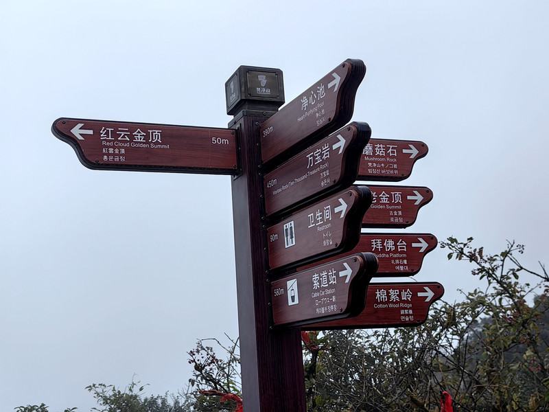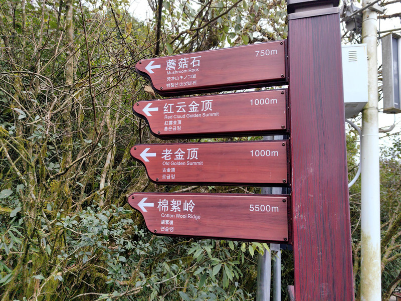 索道站出来后,就得徒步登山了。此处距老金顶、红云金顶各1000米,距蘑菇石750米。攀登的路是木质栈道,不宽,也有滑竿将游客抬至山上,大约几百元吧。听说是攀登约1400多级台阶,实在说,走木栈道还是挺累的,说到累,其实不是登金顶,很多人都说爬木栈道到蘑菇云是最累的,老金顶和红云金顶虽然陡峭但感觉没这么累。攀登过程中,会看到路牌显示前方还有多少米。天是阴的,不时飘来团团雾气,估计连走带歇用了1小时吧,到了蘑菇石区域。