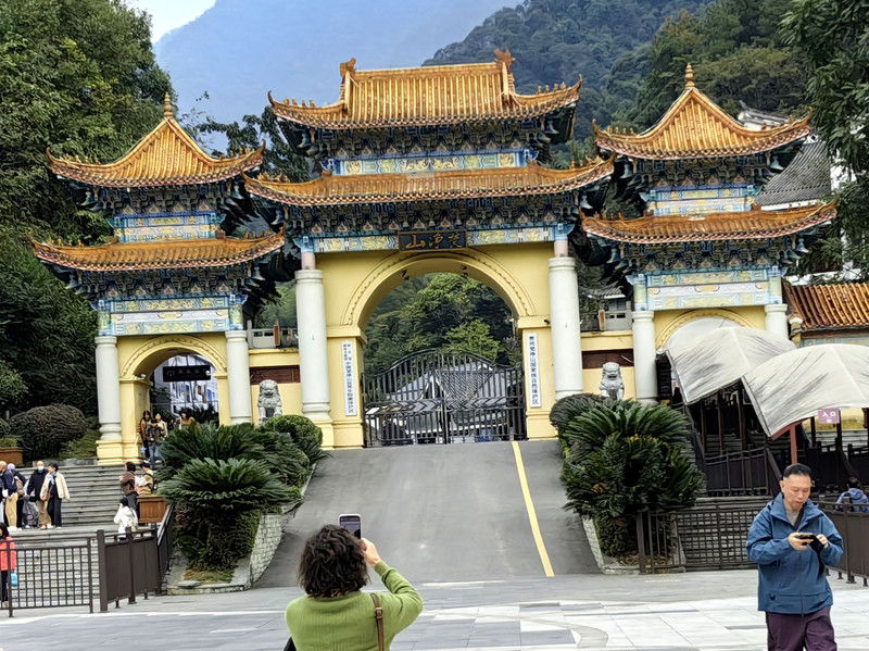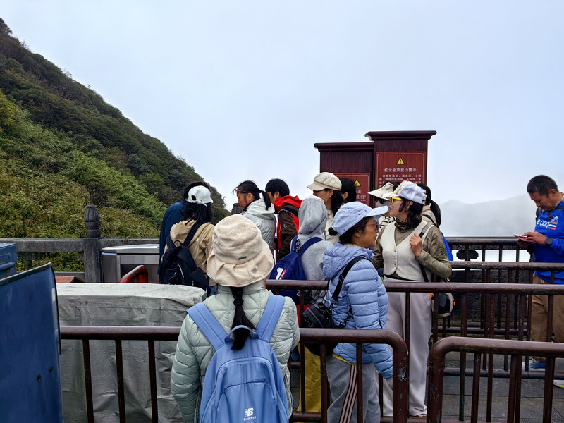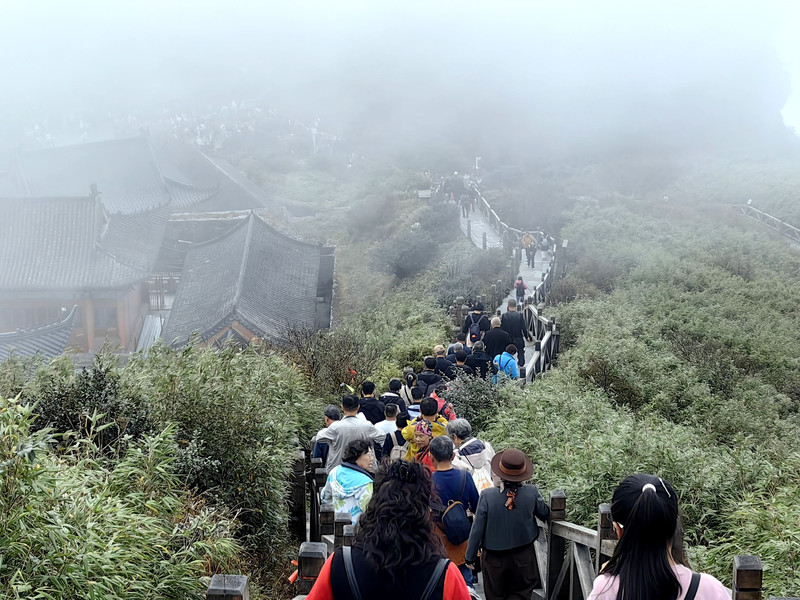 天气好的话就能看到红云金顶,但今天云雾缭绕,红云金顶时隐时现,攀爬的游客成之字形挂在红云金顶半山腰,目测时走时停,隐隐约约。普渡广场上人挺多,有许多桌椅,有人休息,有人等待叫号攀爬红云金顶,叫号一次叫100号。普渡广场有卖食品的商店,有冷热饮,可以在此补充能量。还有一个商店出租登山辅助器材,穿戴上,辅助登山(按小时计费)。我来到旁边的承恩寺浏览,承恩寺原名上茶殿,海拔2572米,是山顶寺庙群主体建筑。始建于明初,明万历四十六年(1618年)敕建并命名,现存建筑为2009年在原址重建,2011年完工。