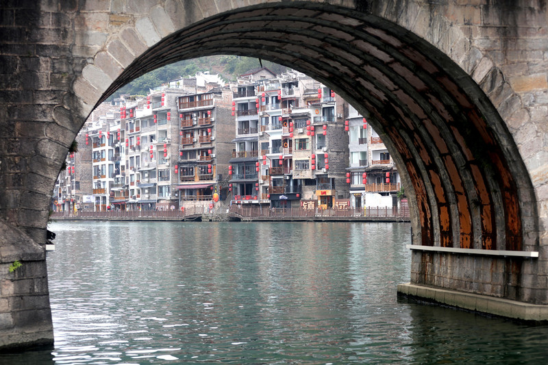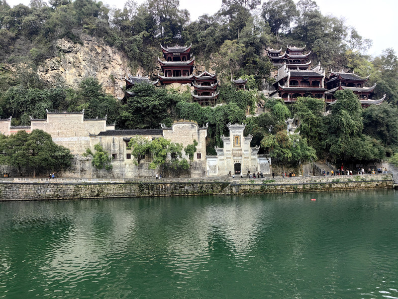 返回古街继续西行,走到古街尽头-新大桥。过新大桥后,如果继续南行,可以参观和平村旧址、周达文故居等遗迹。我们没去,过桥后延南岸转向东行,在水岸边步行,对岸古建筑水中拔起,屋脊交错。我们穿行在岸边的各式酒馆、咖啡屋间,不久就到了东边的青龙洞。