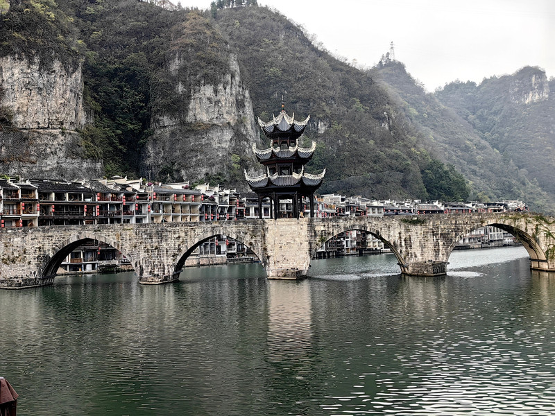 游览没看时间,估计1小时游览完毕,出来就是祝圣桥。祝圣桥原名“舞溪桥”,是一座由青石建造的七孔桥。该桥始建于明洪武二年(1369年),该桥墩建于明代,桥身却建于清代。后因康熙祝寿,更名“祝圣桥”。此桥为滇黔学子进京赶考必经之路,桥中央有一个三层三檐八角攒尖顶楼阁建筑,称为状元楼、魁星阁。