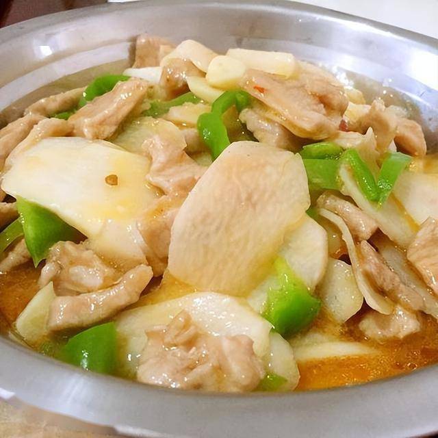 食材:山药150g、肉片200g、彩椒、木耳、油、盐、葱姜、淀粉、胡椒粉、糖、鸡精
