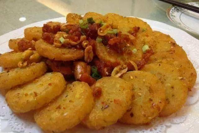 1. 土豆切成薄片,清水洗去表面淀粉,沥干水分;炒锅倒油烧热,下入土豆片煎至两面金黄,捞出备用;腊肉切薄片。