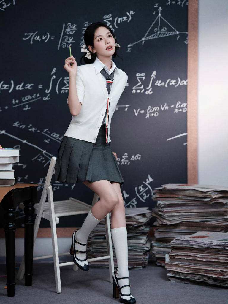 镜头里的她,姿态是松弛的:或是举着放大镜凑近镜头,眼尾弯出雀跃的弧度,像发现了习题册里的小秘密;或是把铅笔咬在唇间,指尖轻抬的模样带着点漫不经心的俏皮;又或是倚着椅子垂眸,领口的褶皱都浸着慵懒的少年感。黑板上的公式是冷硬的理性符号,她却用笑意与小动作,把这里变成了“青春专属的温柔场域”——连堆叠的书本与试卷,都成了她灵动气质的背景板。