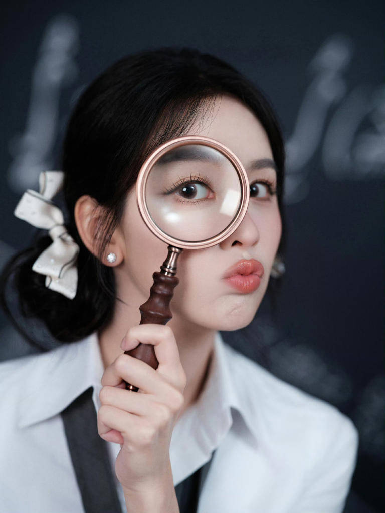 她的美,从来不是浓烈的冲击,而是像白衬衫一样的“舒适系惊艳”。皮肤是清透的冷调白,眉眼是舒展的淡颜系,却在细节里藏着张力:唇间的淡粉是软的,眼尾的弧度是弯的,连握着放大镜的指尖都带着点漫不经心的娇俏。这种“淡而有韵”的气质,让她既能hold住清冷的文艺感,也能把学生装的鲜活感诠释得恰到好处——就像把“白开水”酿成了带着回甘的蜜茶。