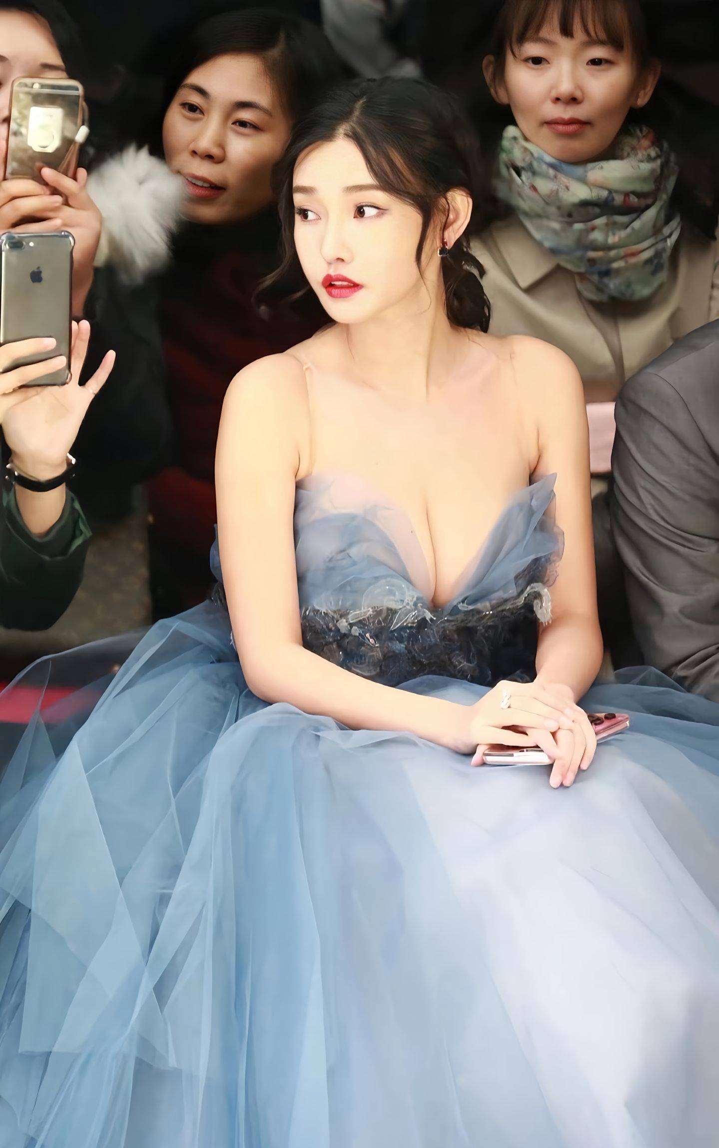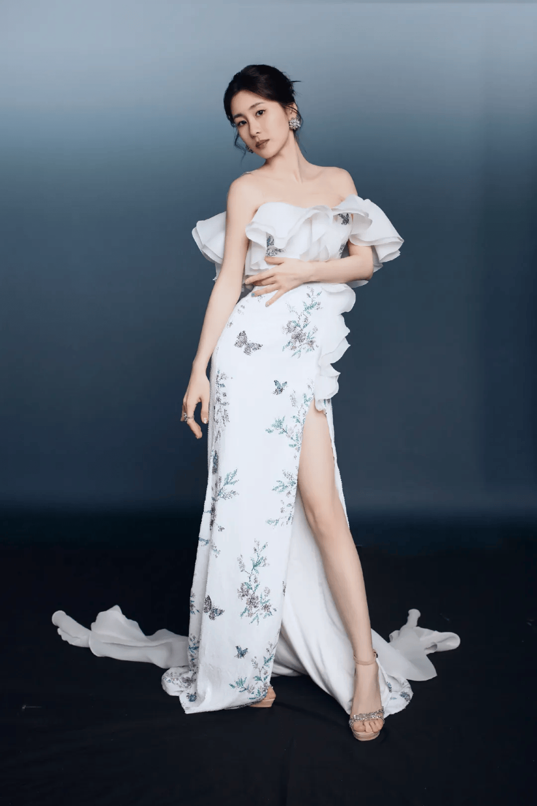 裙子的版型也是一绝。它紧紧贴合着赵露思的身体曲线,从胸部到腰部,再到臀部,每一处都勾勒得恰到好处,将她那凹凸有致的身材展现得淋漓尽致。腰部的设计特别巧妙,收腰收得刚刚好,既凸显了她纤细的腰肢,又不会让人觉得过于紧绷。而裙摆则像一朵盛开的白色花朵,缓缓散开,随着她的动作轻轻摆动,优雅又灵动,仿佛自带仙气。